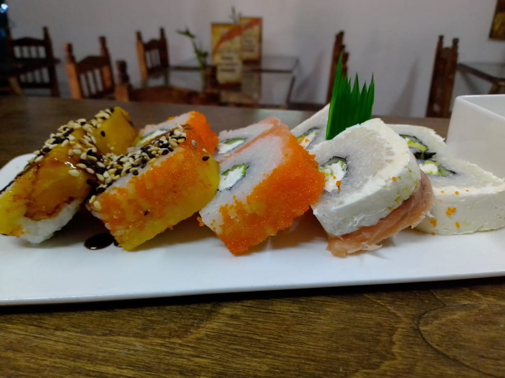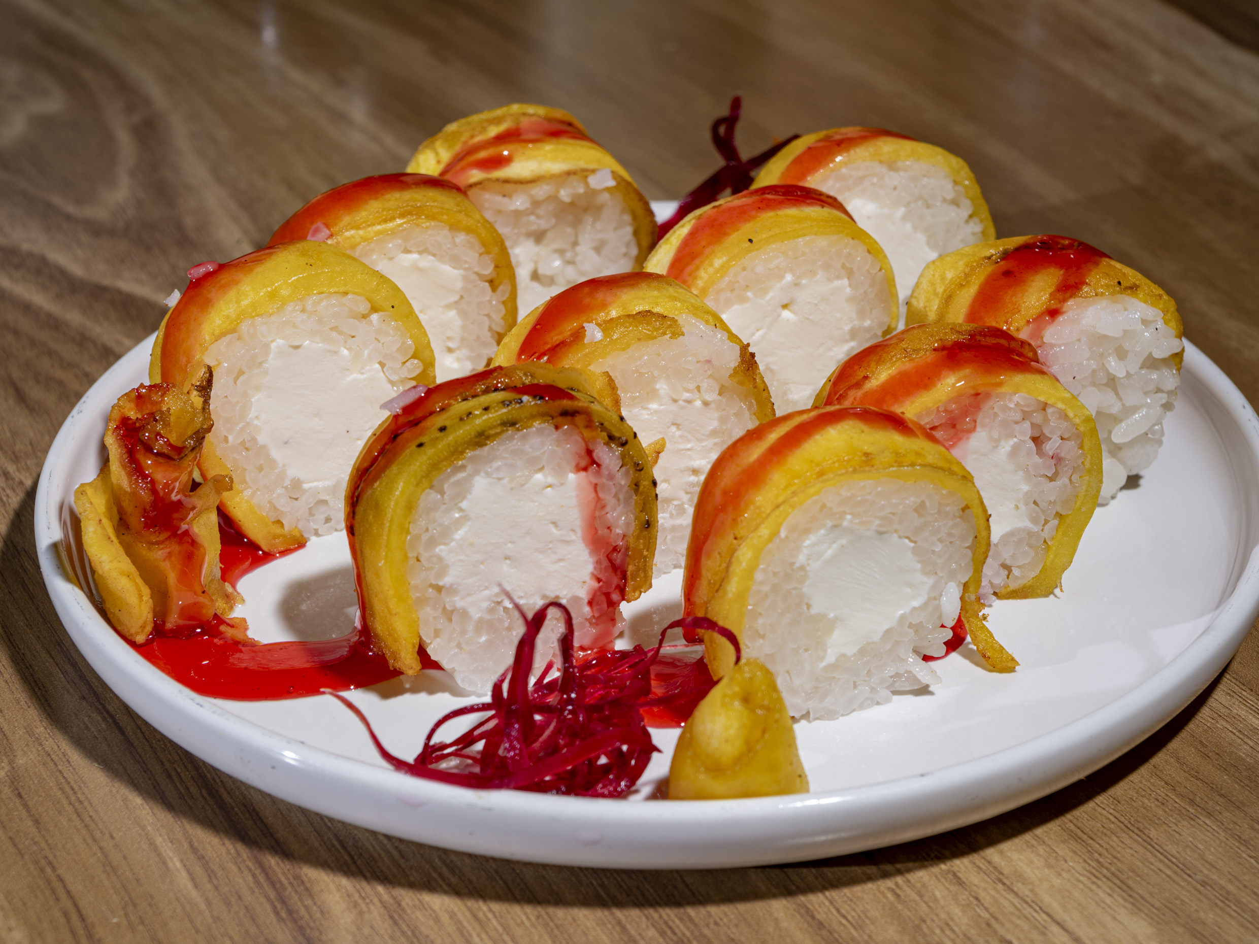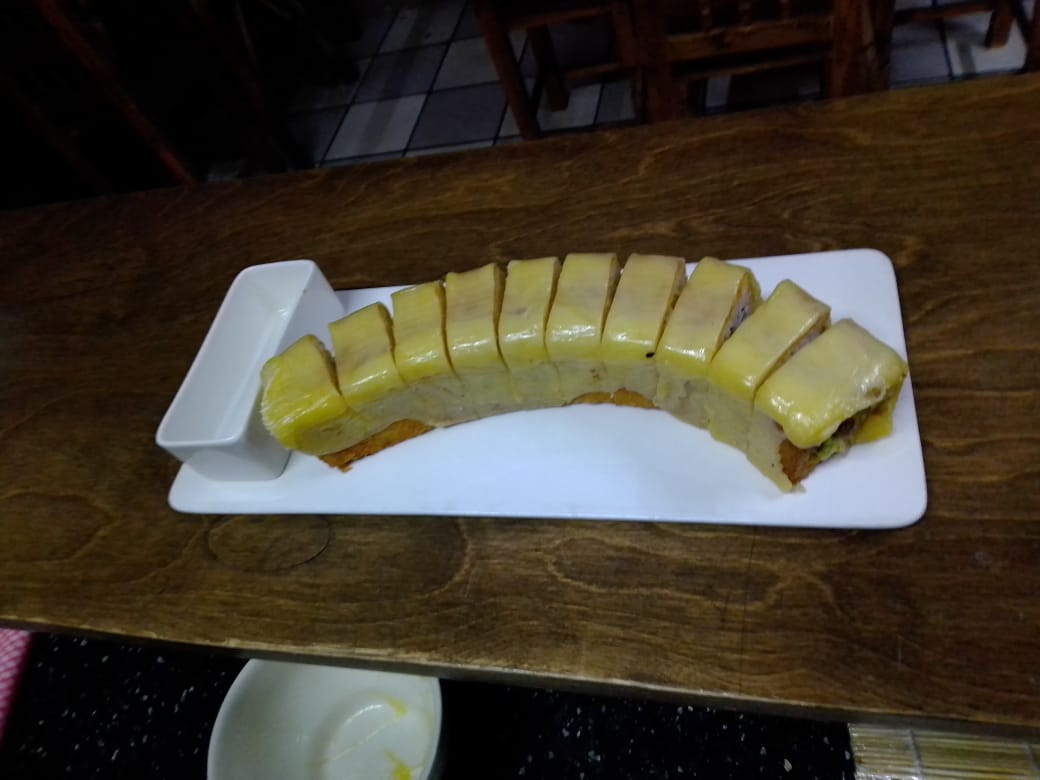 Plátanp, queso y salmón y masago por fuera, pepino, queso y aguacate por dentro.