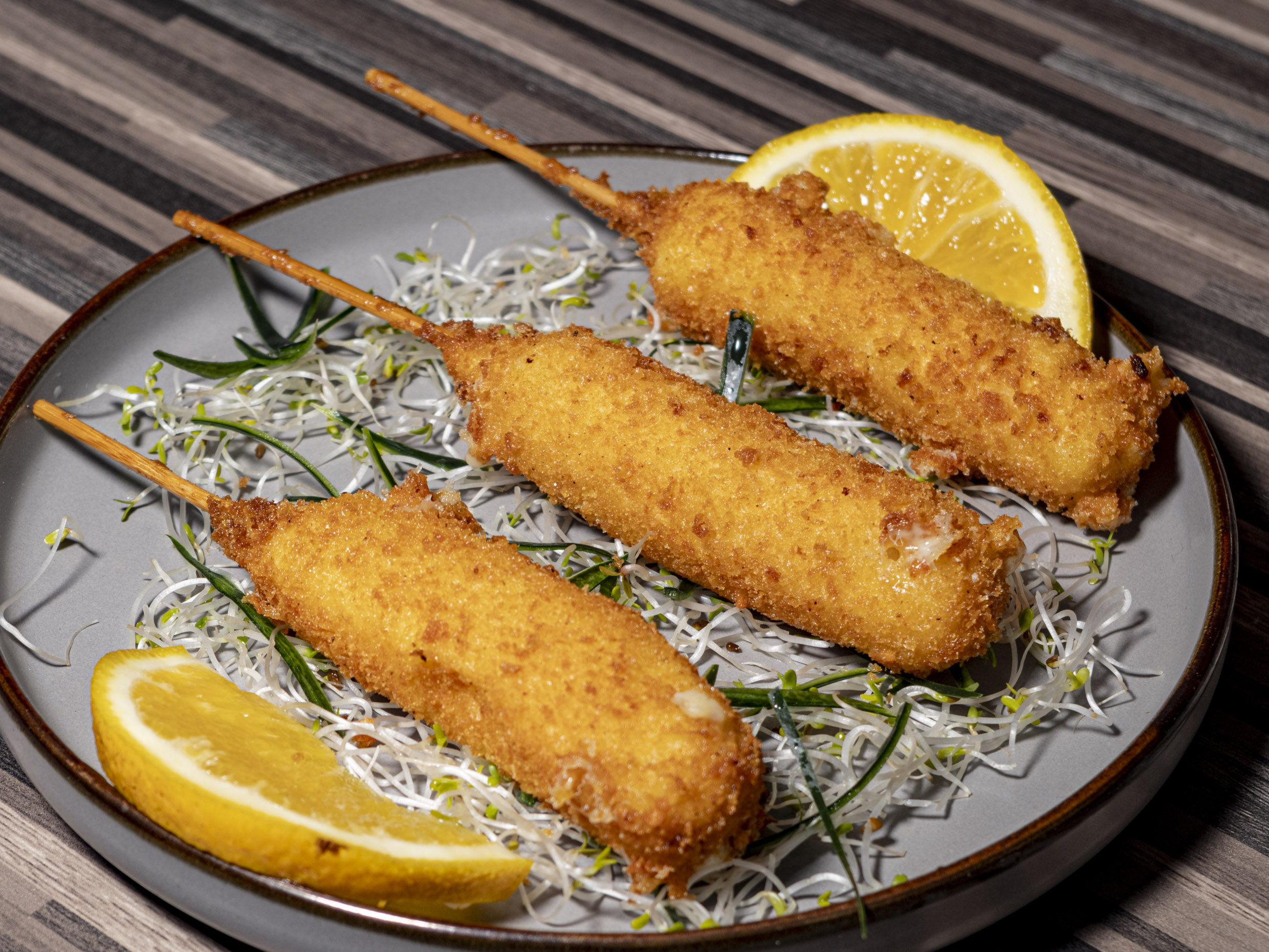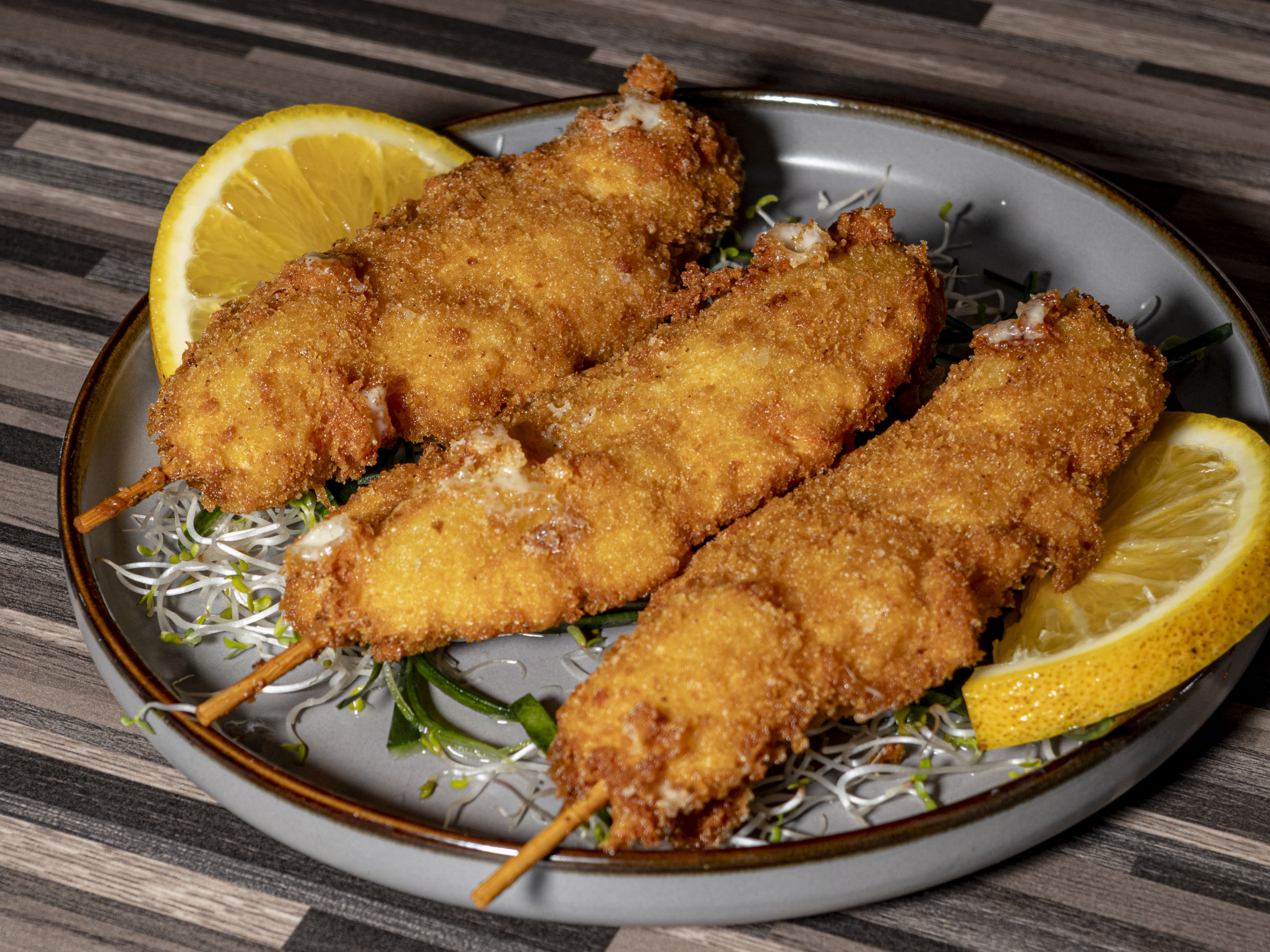 Kanikama frito por fuera, queso y aguacate por dentro.