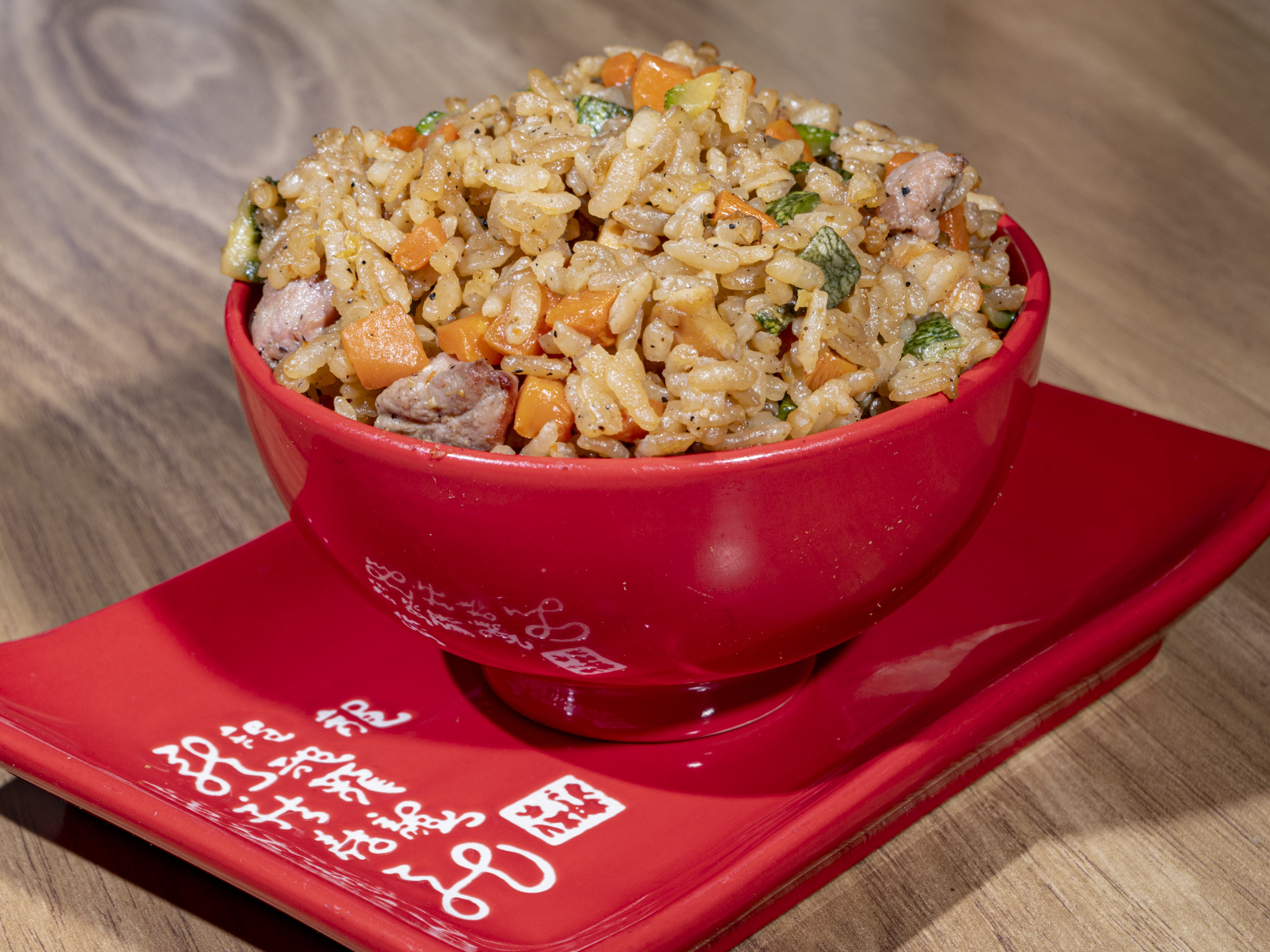 Arroz frito con verduras, pollo, arrachera y salsa Tampico