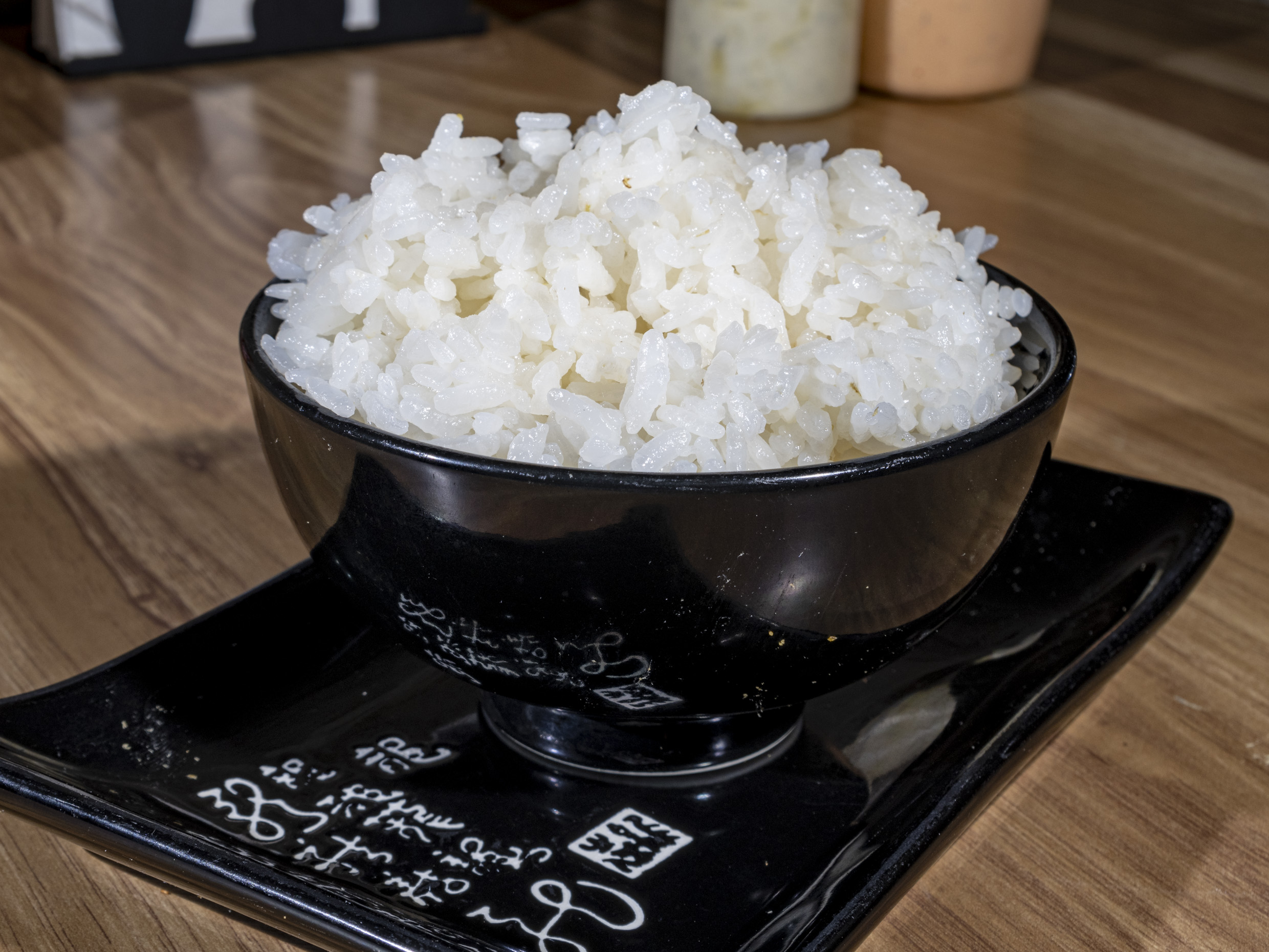 Arroz blanco al vapor con salsa tampico, pollo asado y camaron. A elegir bañado con o sin togarashi.