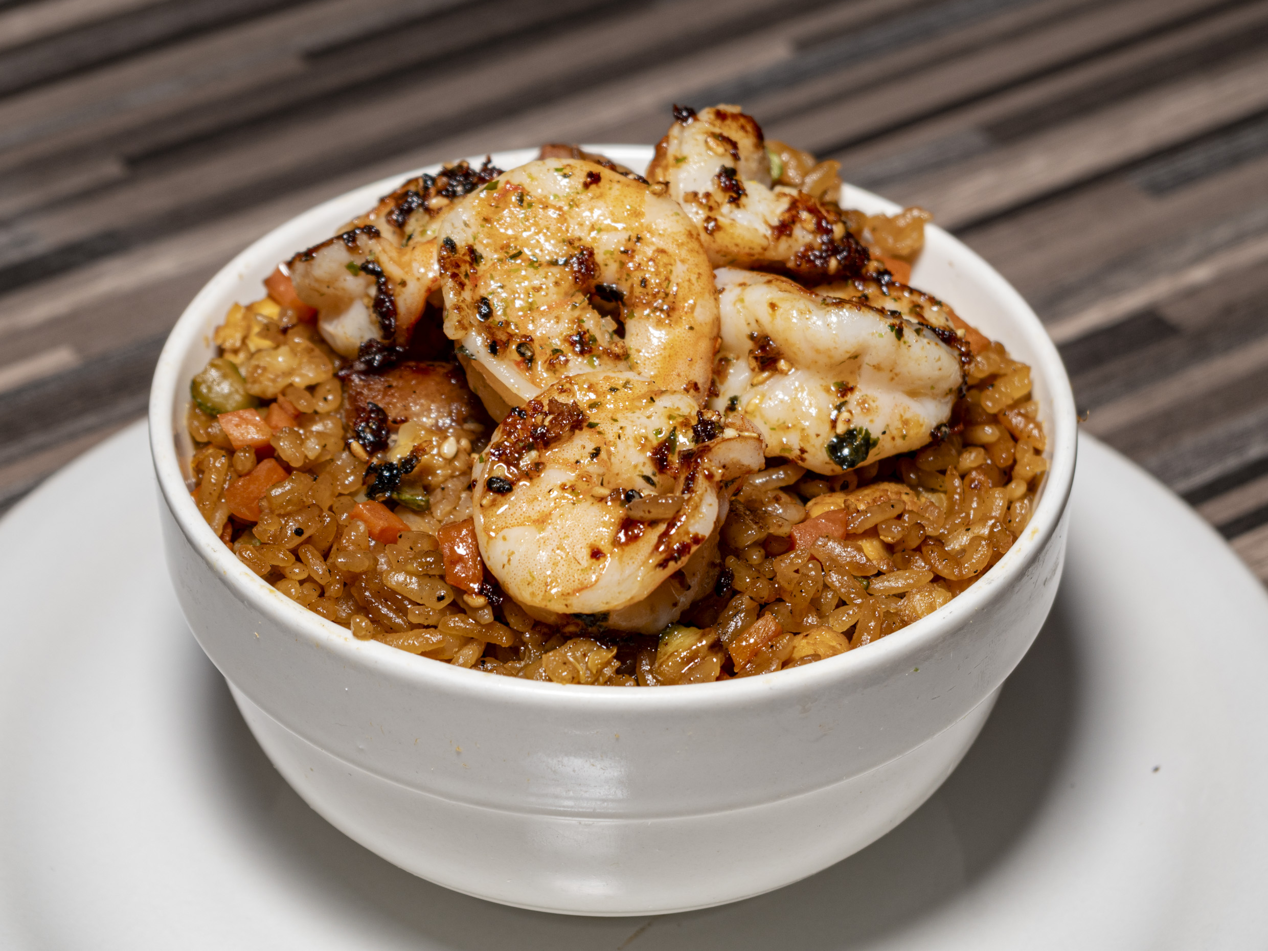 Arroz frito con verduras, pollo, arrachera, salsa Tampico, Camarón, aguacate y salsa sirasha, bañado con furikake