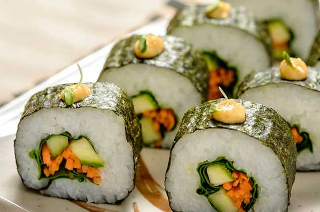 Alga por fuera, queso, pepino, aguacate, zanahoria fileteada por dentro.