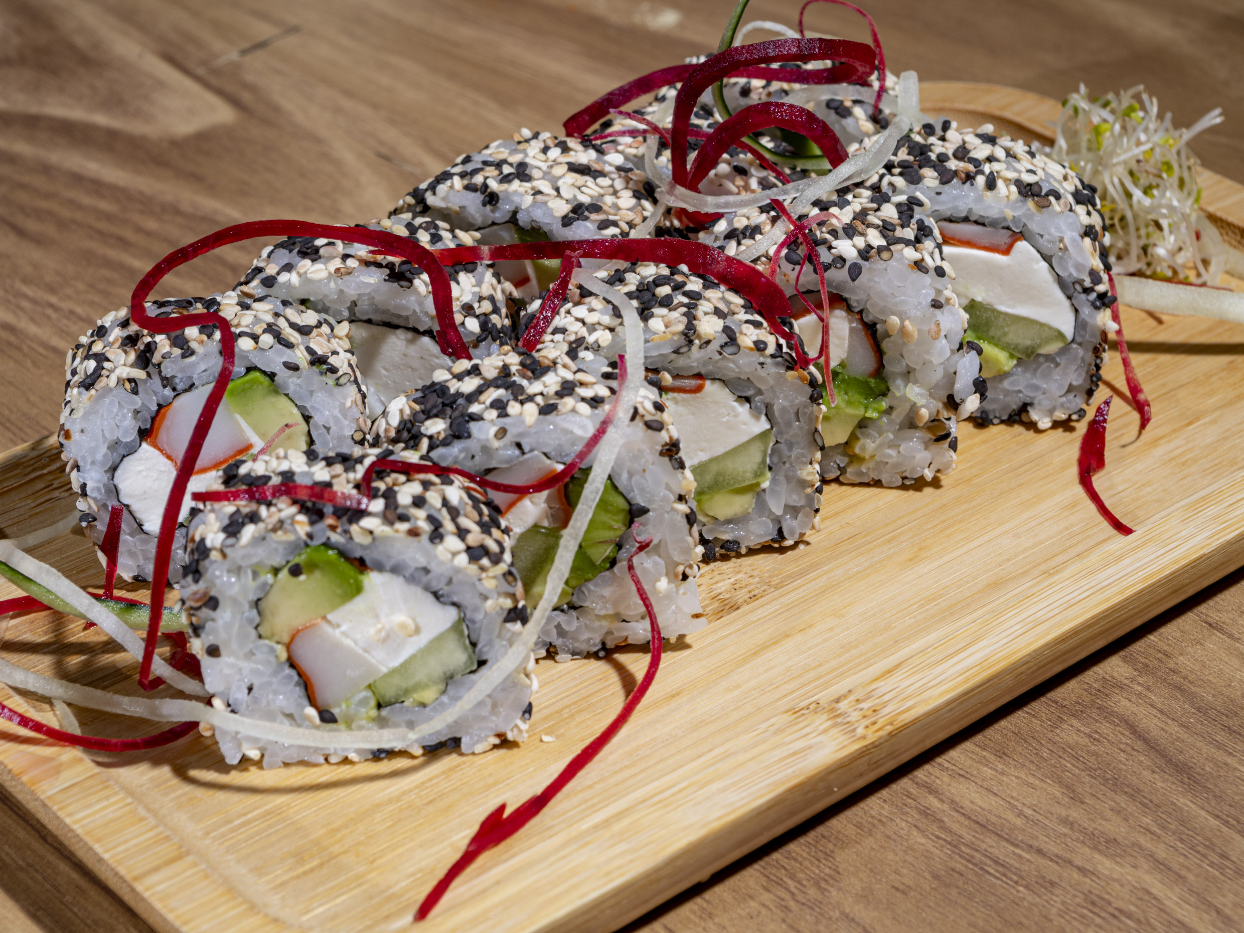 Ajonjolí por fuera, queso, pepino, aguacate por dentro.