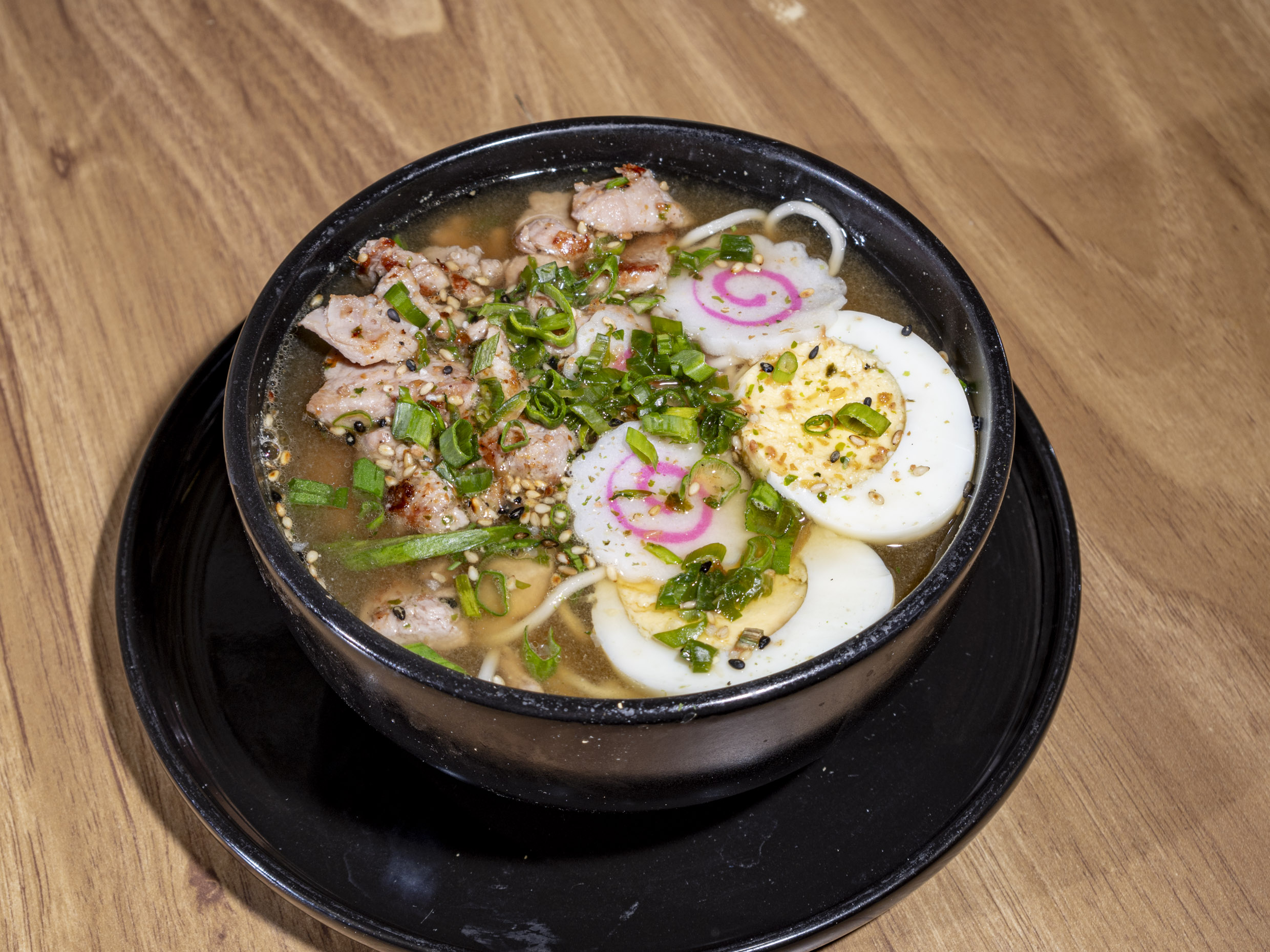 Caldosa pasta ramen, espinacas, zetas, huevo hervido, cebollin. Proteina a elegir.