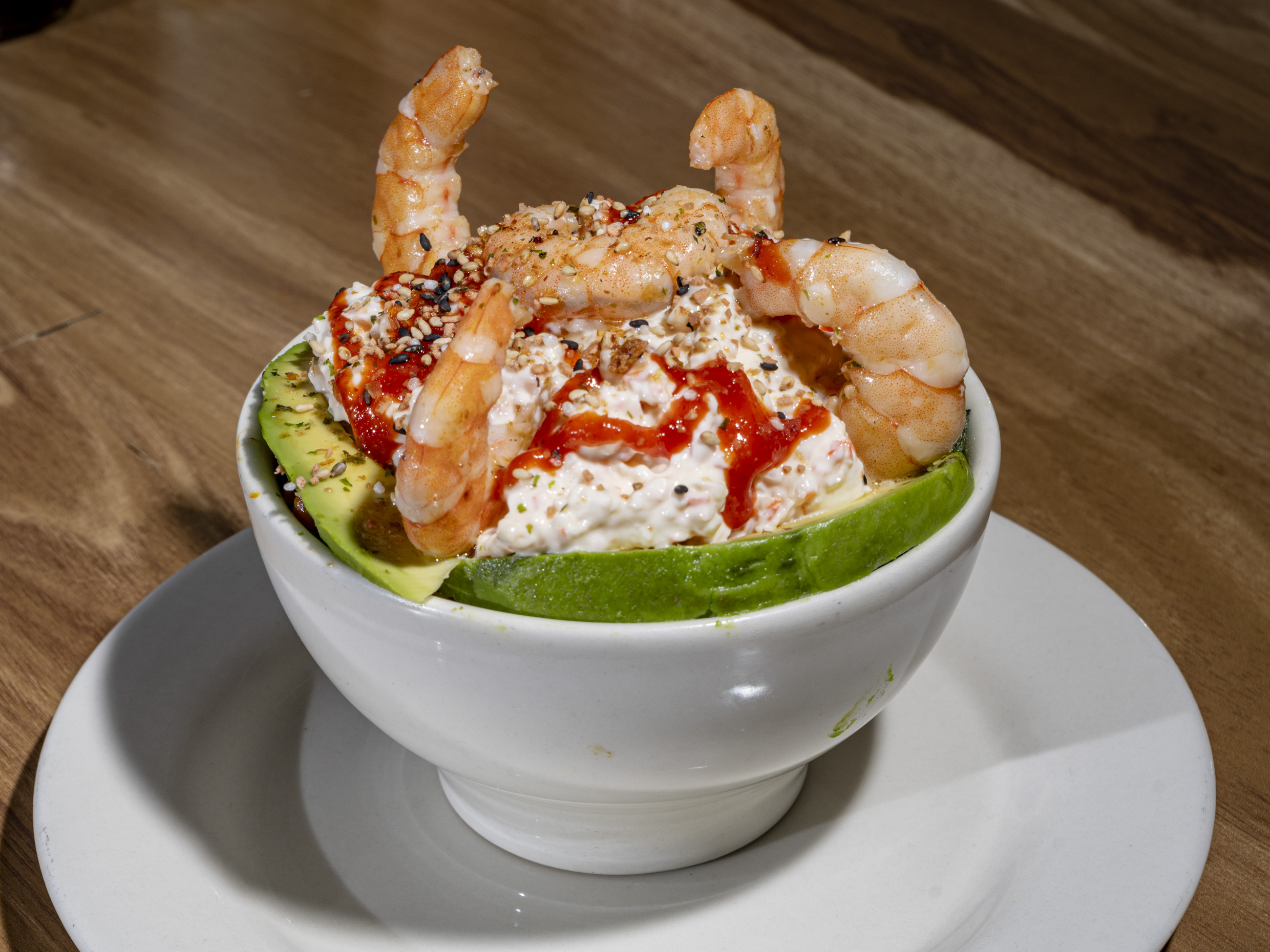 Aguacate por fuera, queso, pepino y camarón por dentro.