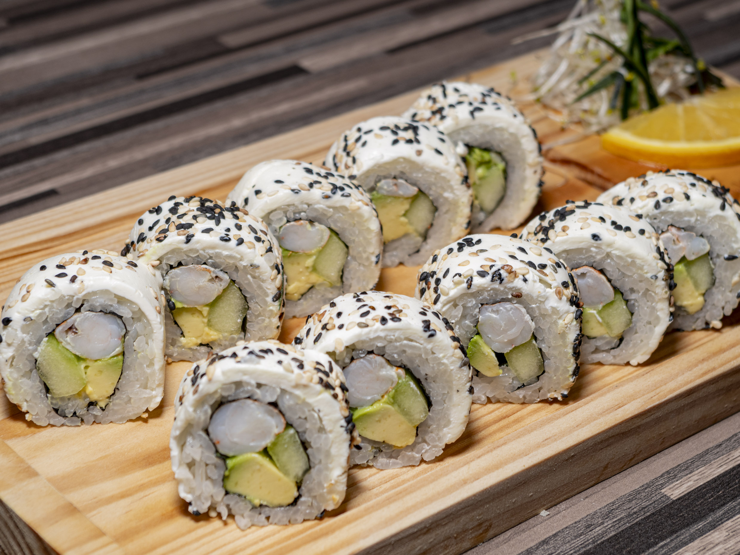 Philadelphia y ajonjolí por fuera, pepino, camarón y aguacate por dentro.