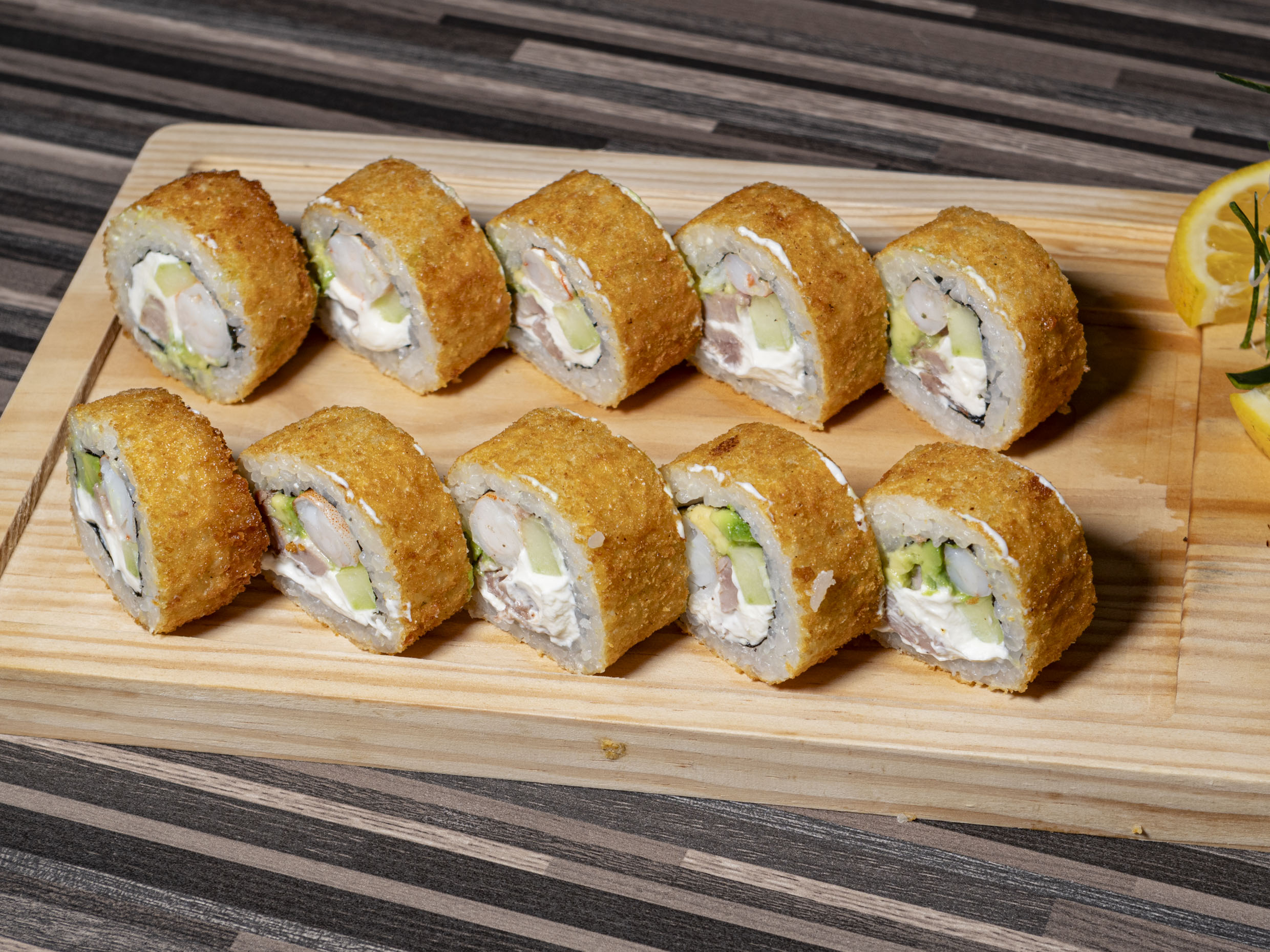 Salmón asado y Philadelphia por fuera, aguacate, pepino y camarón empanizado por dentro.