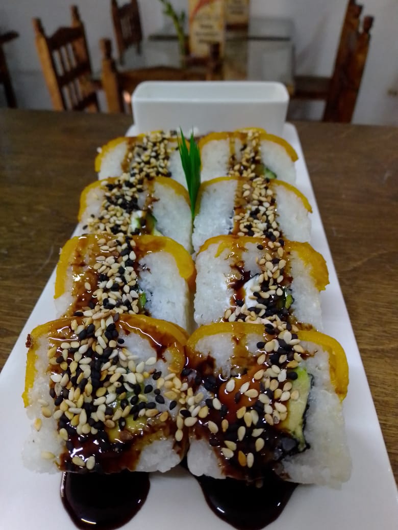 Relleno de queso philadelphia, pepino, camaron tempurizado. Por fuera masago forrado de aguacate con toque de sasa sirasha y salsa de aguila.