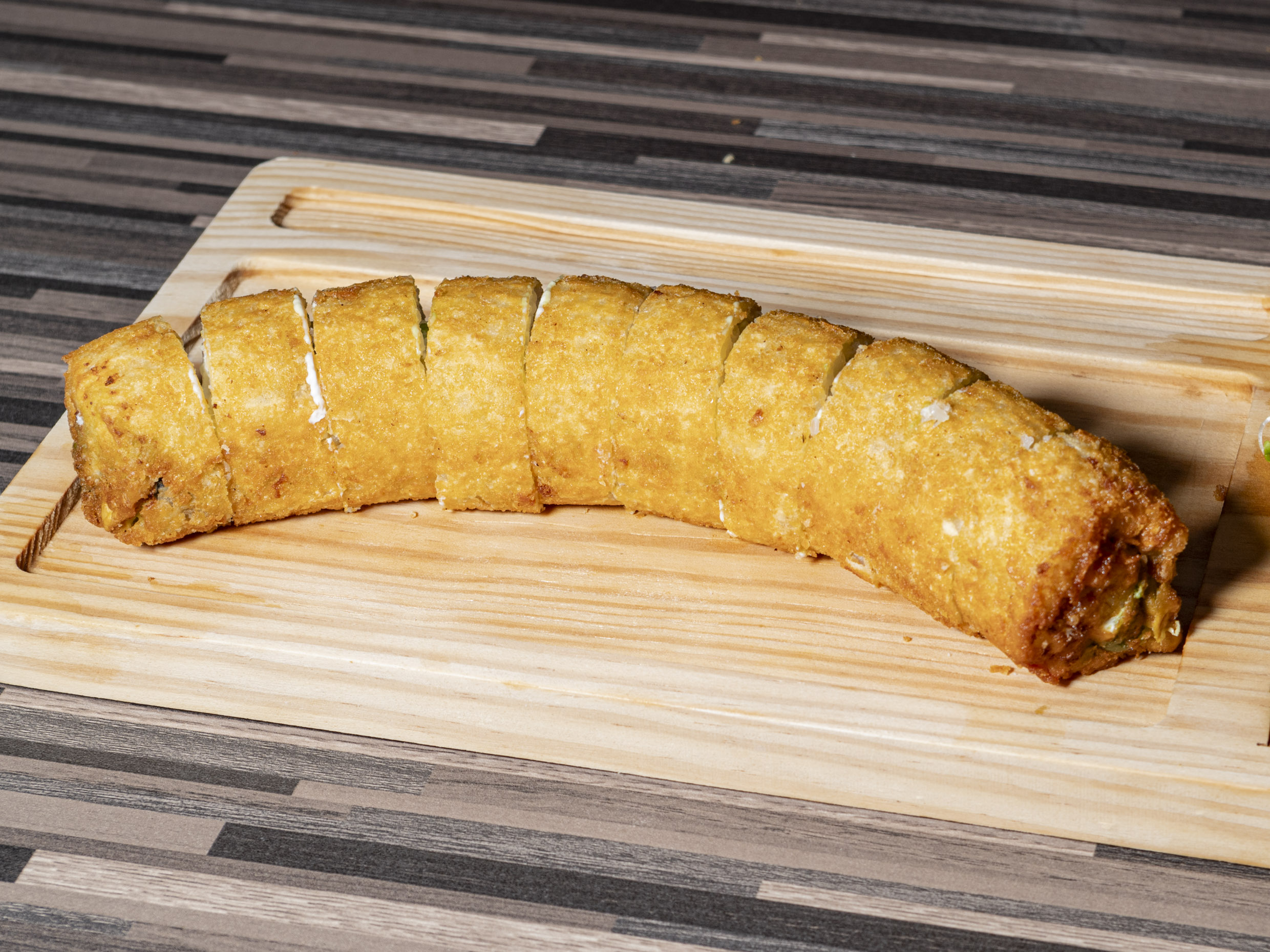 Empanizado por fuera cubierto de queso manchego gratinado, queso, pepino, aguacate y arrachera por dentro.