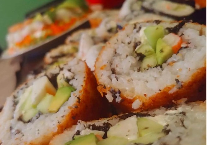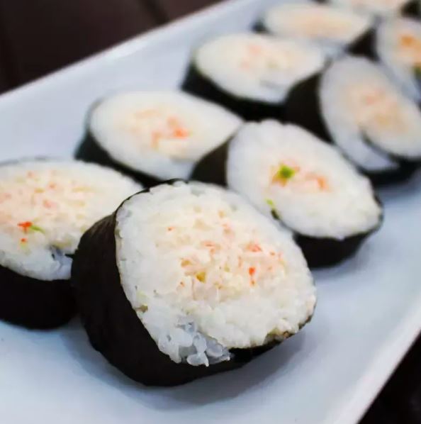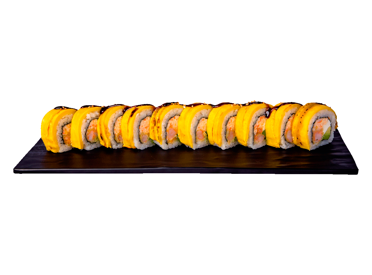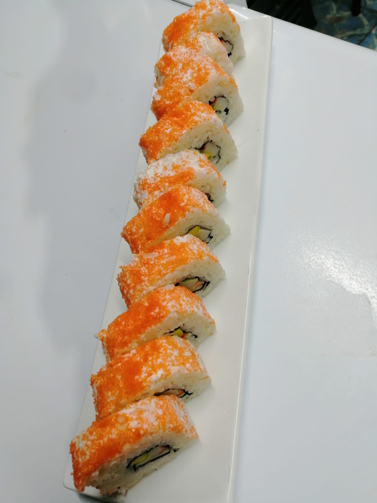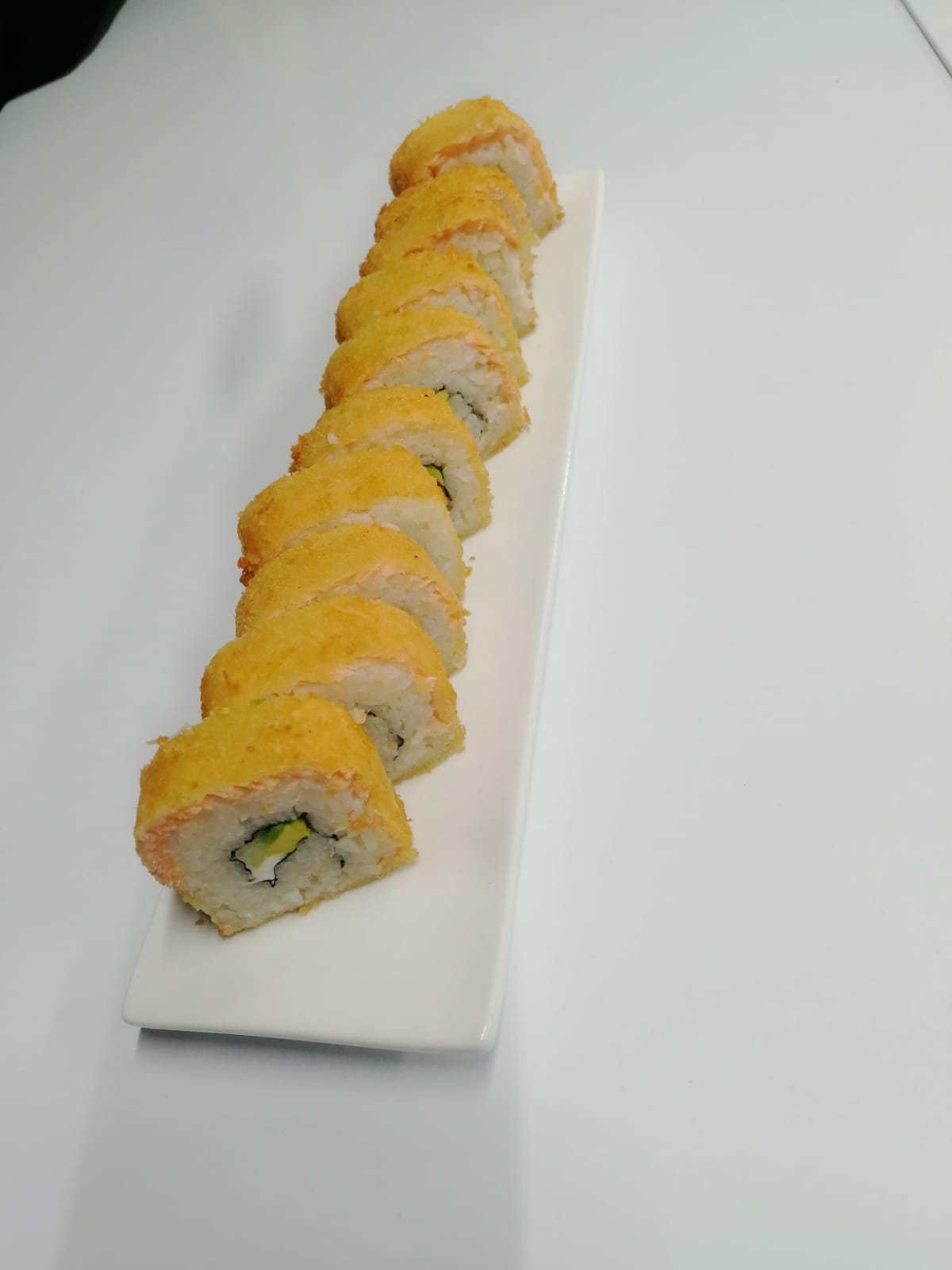 10 Piezas de rollos con pepino, aguacate y surimi por dentro además de queso y masago por fuera.
