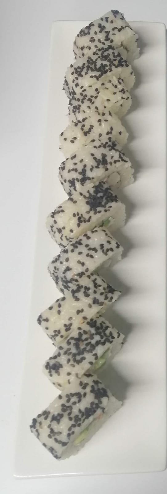 10 Piezas de rollos con queso, pepino, aguacate y surimi por dentro, ajonjolí por fuera.