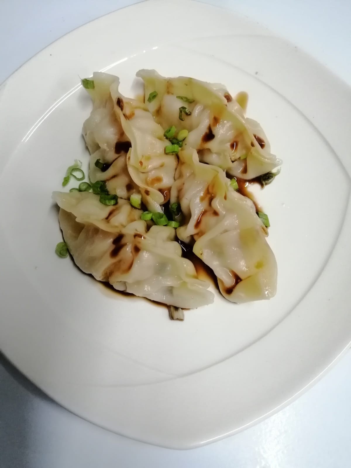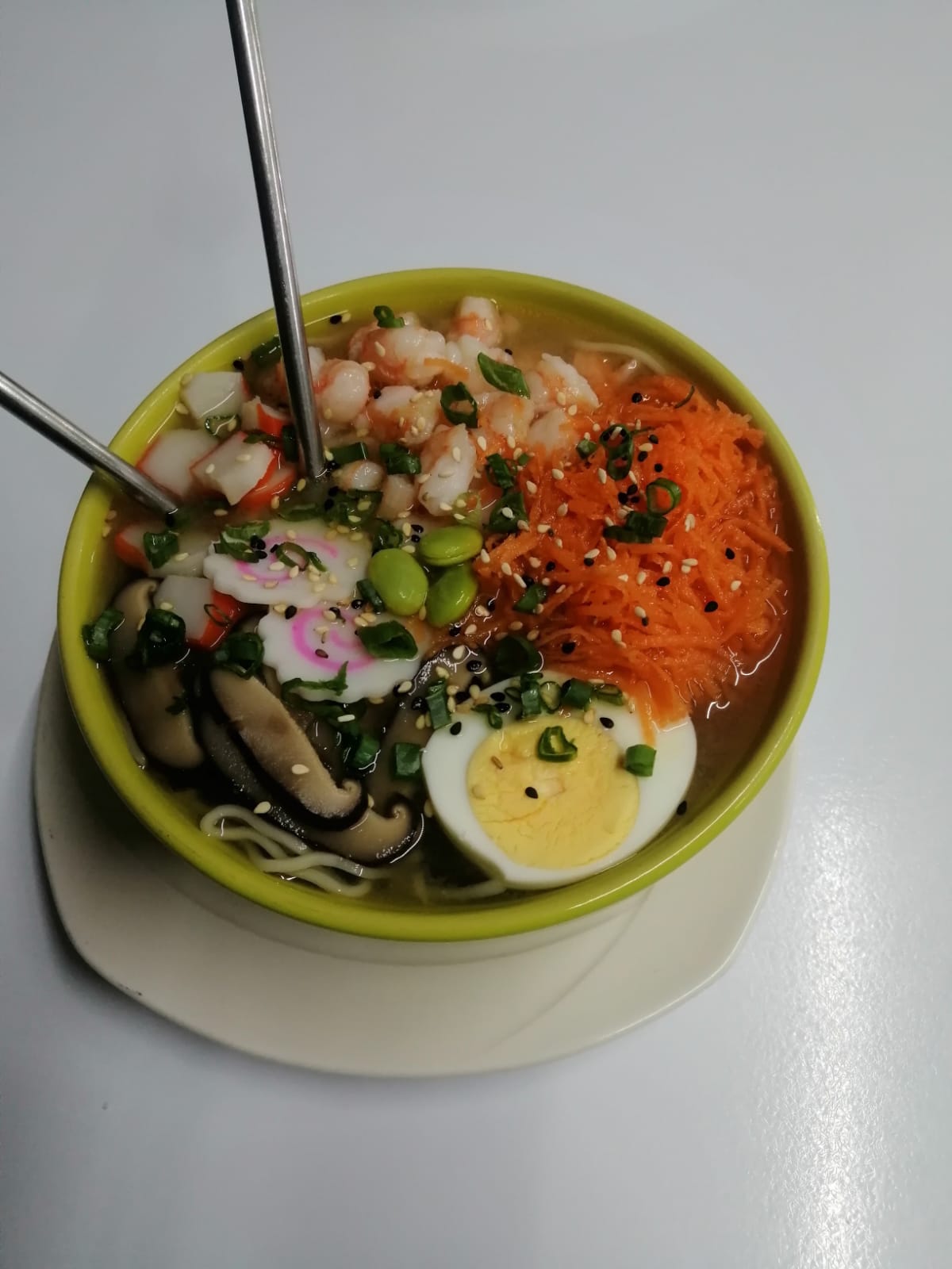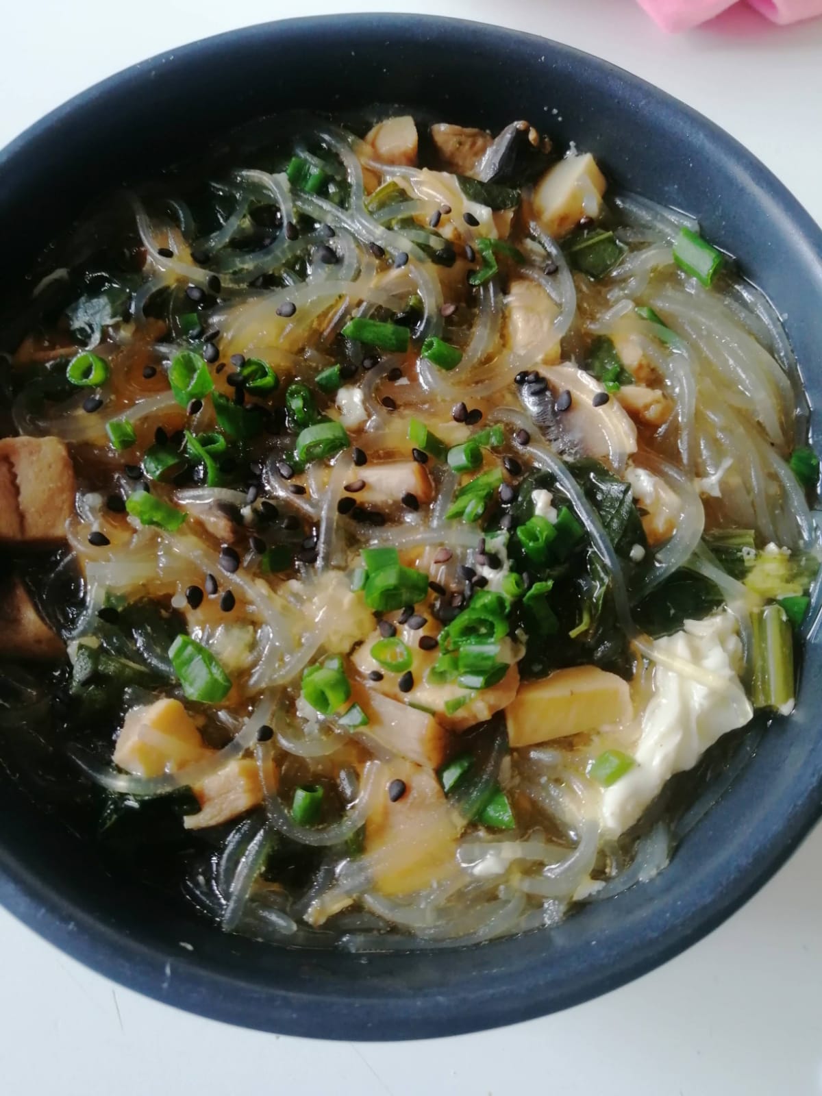Pollo, champiñones, espinaca, cebollín, fideos, huevo y soya.