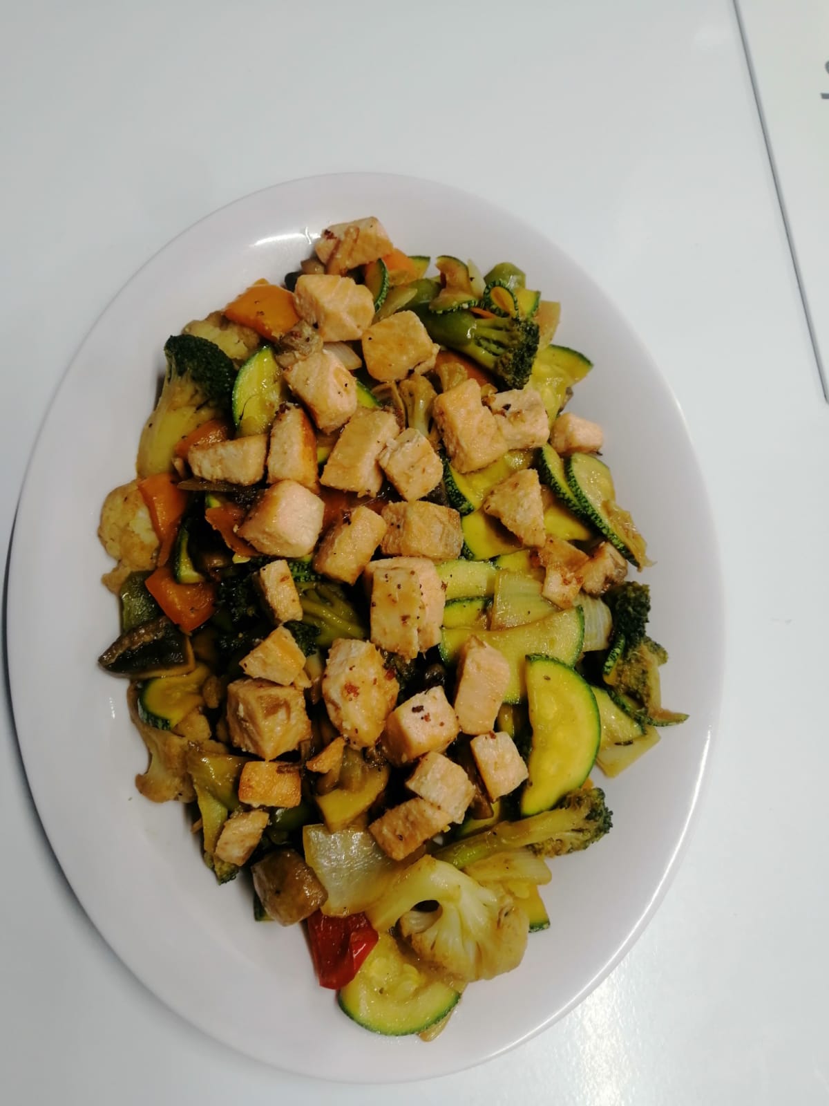 Brócoli al vapor con pollo, zanahoria, cebolla y brócoli en salsa agridulce.