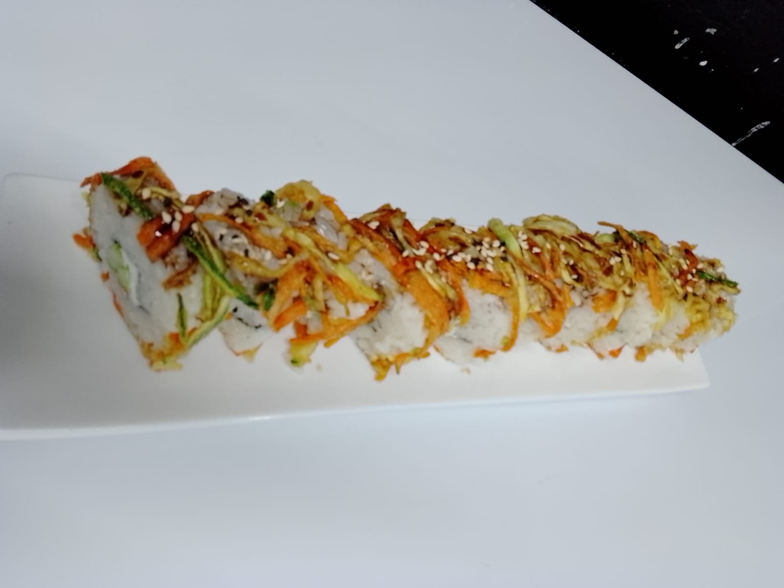 10 Piezas de rollos con queso, pepino, aguacate y salmón empanizado por dentro. Calabaza y zanahoria en tempura por fuera.