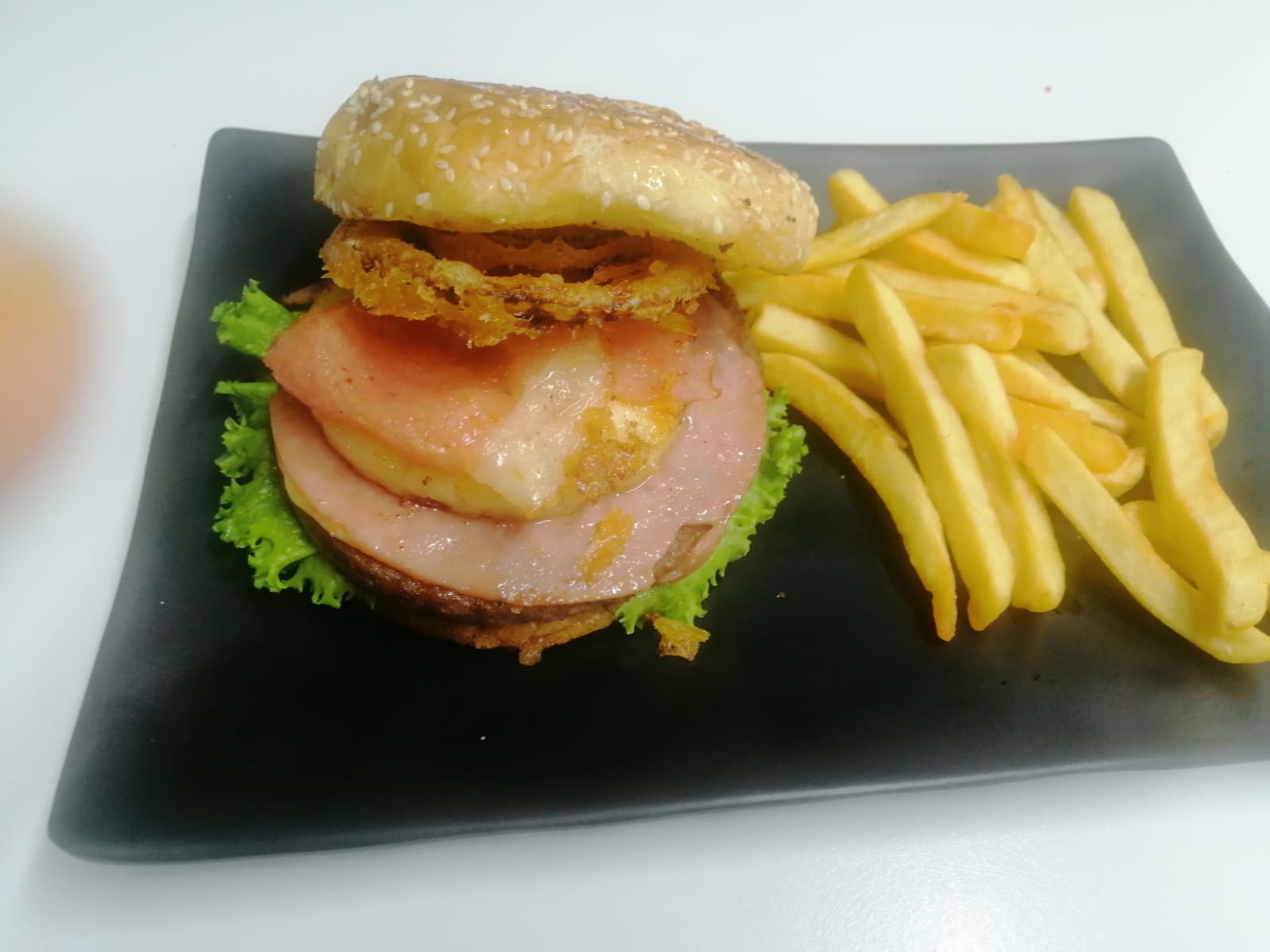 HAMBURGUESA HAWAINA + PAPAS + AROS DE CEBOLLA