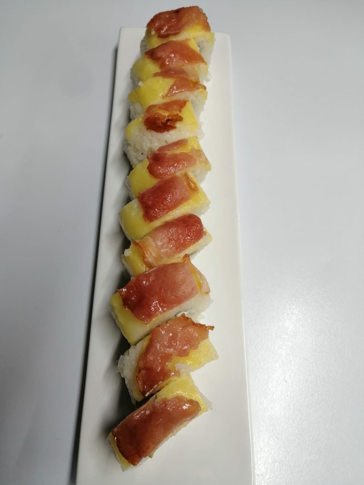 10 Piezas de rollos con queso, pepino, aguacate, pollo empanizado por dentro, manchego gratinado por fuera con tocino y salsa sriracha.