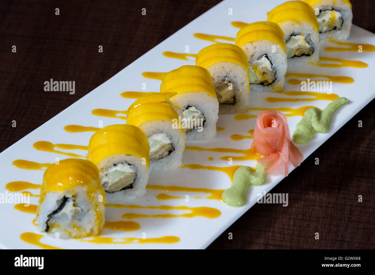 10 Piezas de rollos queso, pepino, zanahoria por dentro, queso y mango, por fuera con aderezo de mango.