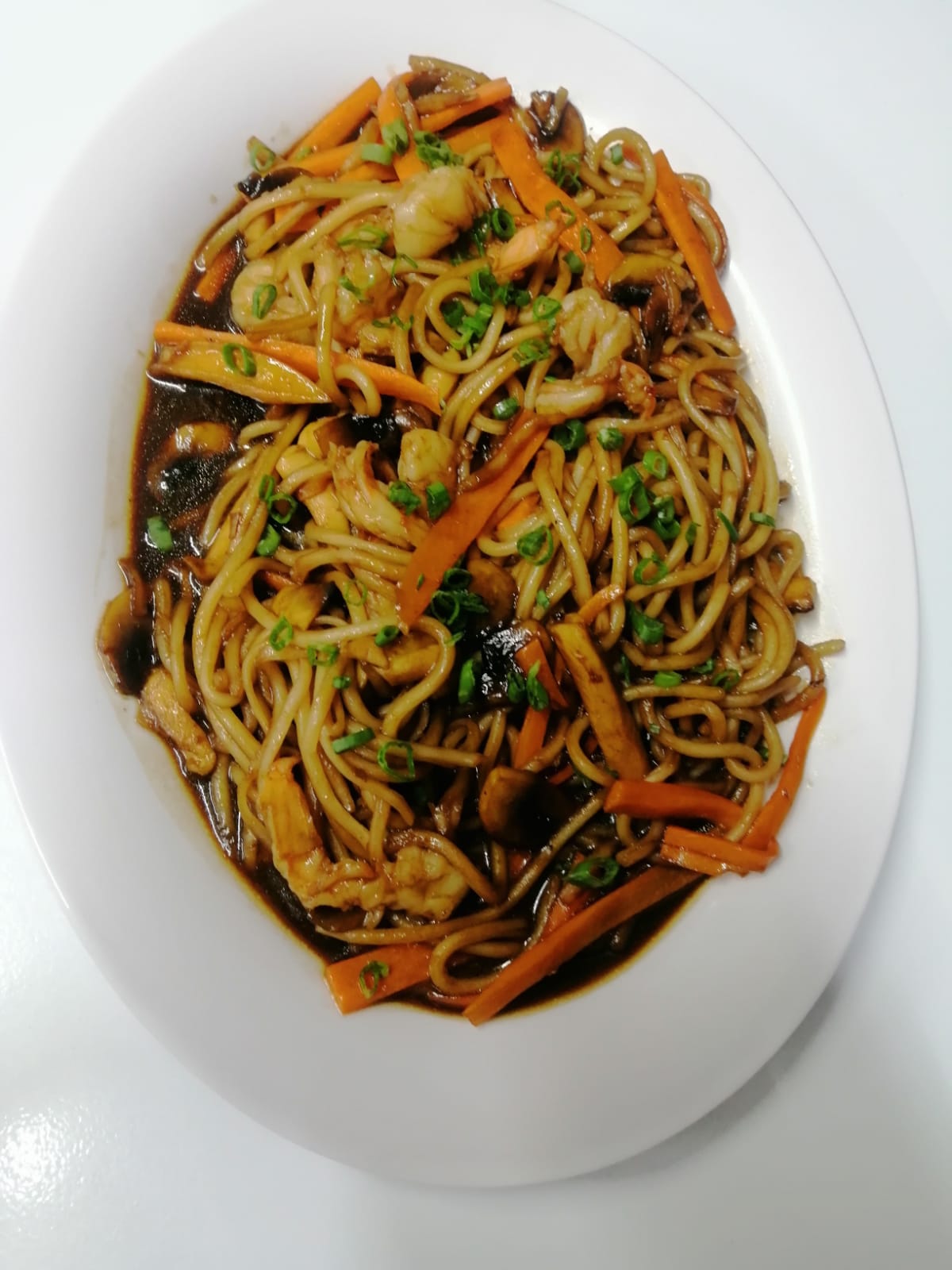 Tallarines con pollo, camarón, zanahoria, champiñón en salsa agridulce.