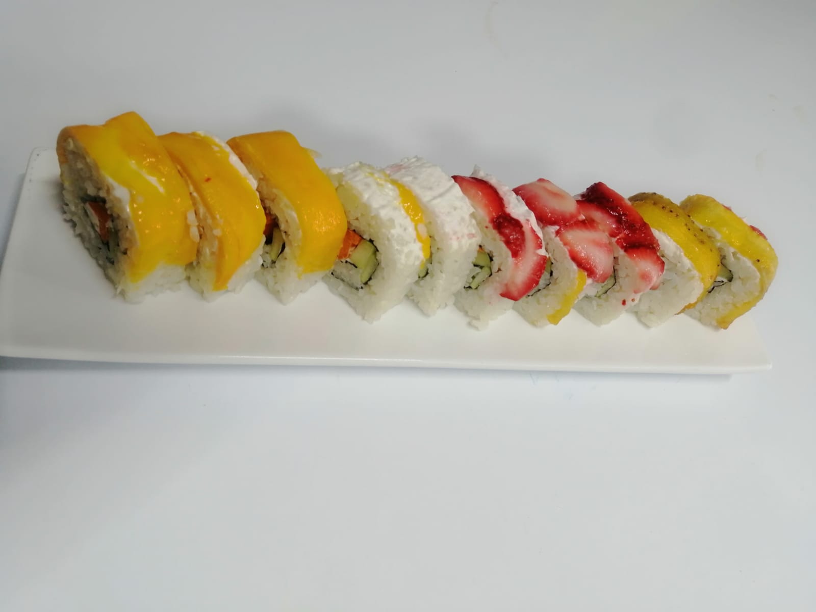 10 Piezas de rollos con queso, pepino y zanahoria por dentro. Plátano, mango, fresa y queso por fuera con salsa de mango.