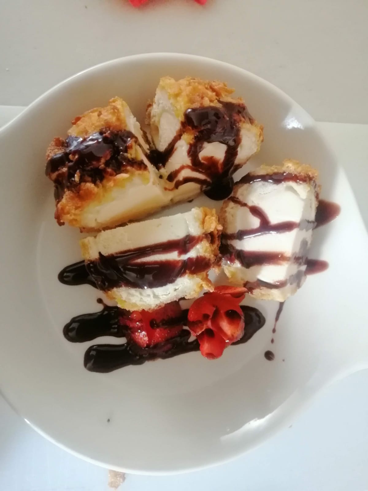 Rellenos de philadelphia, con bola de helado. Con cajeta o chocolate. Con helado de vainilla.