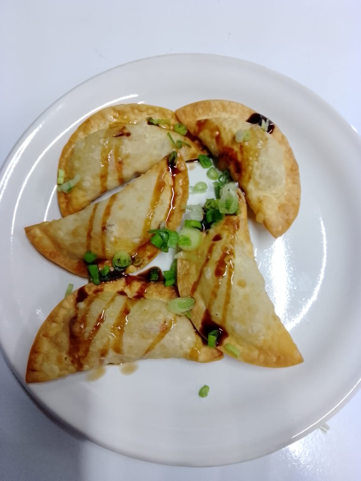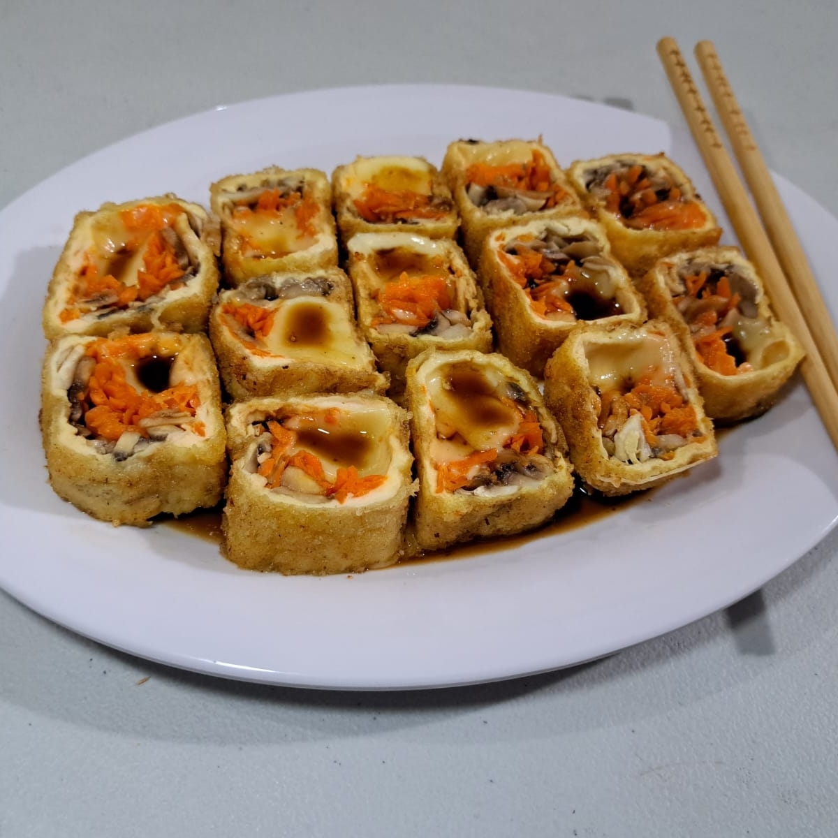 10 Piezas de rollos con queso, aguacate y pepino por dentro, plátano frito por fuera con salsa de anguila y ajonjolí.