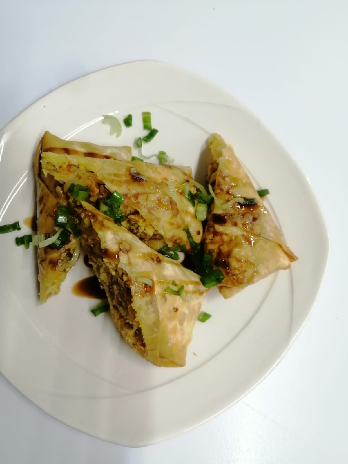 10 Piezas de rollos con chorizo, aguacate y pepino por dentro con manchego gratinado con salsa macha y ajonjolí por fuera.