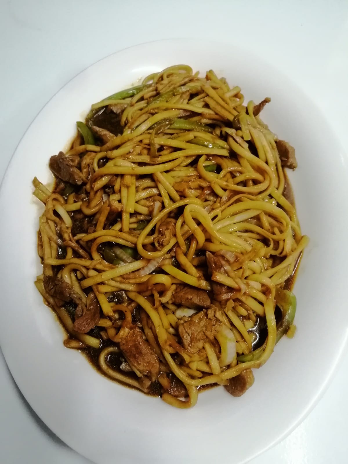 Tallarines con cebolla, pimiento y arrachera en salsa especial.