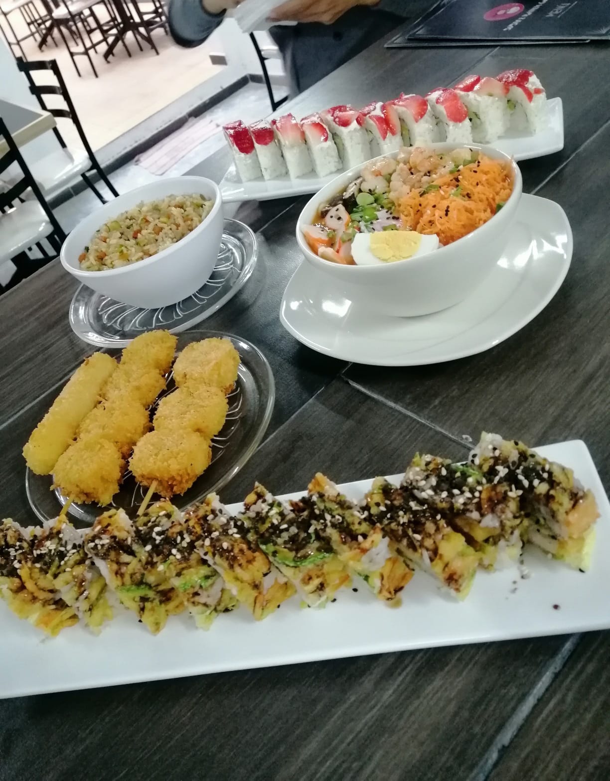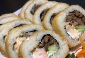 10 Piezas de rollos con queso, pepino, aguacate, pollo y tocino por dentro, manchego gratinado con carne y chile por fuera.