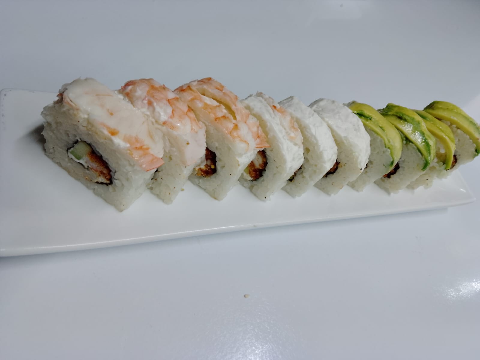 10 Piezas de rollos con queso, pepino, camarón por dentro, aguacate por fuera con salsa de anguila y ajonjolí.