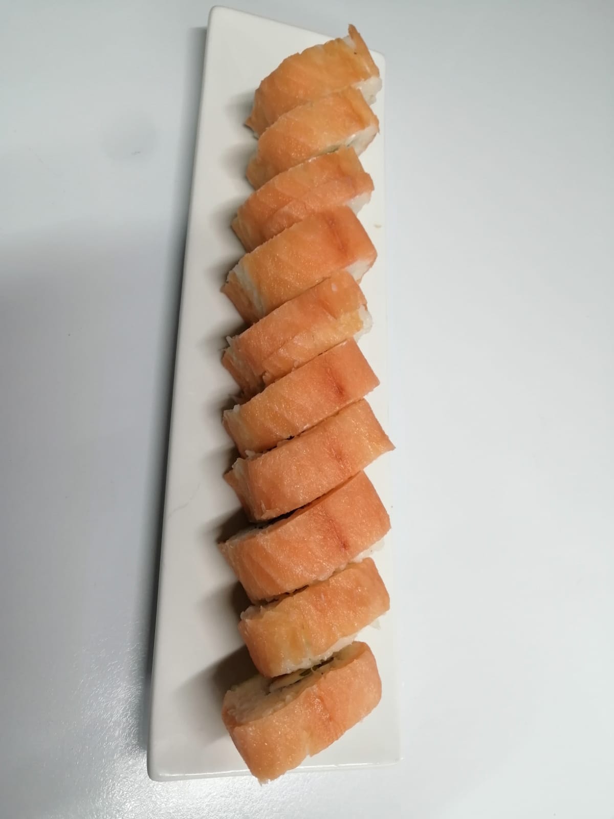 10 Piezas de rollos con queso, pepino, aguacate por dentro y salmón por fuera.