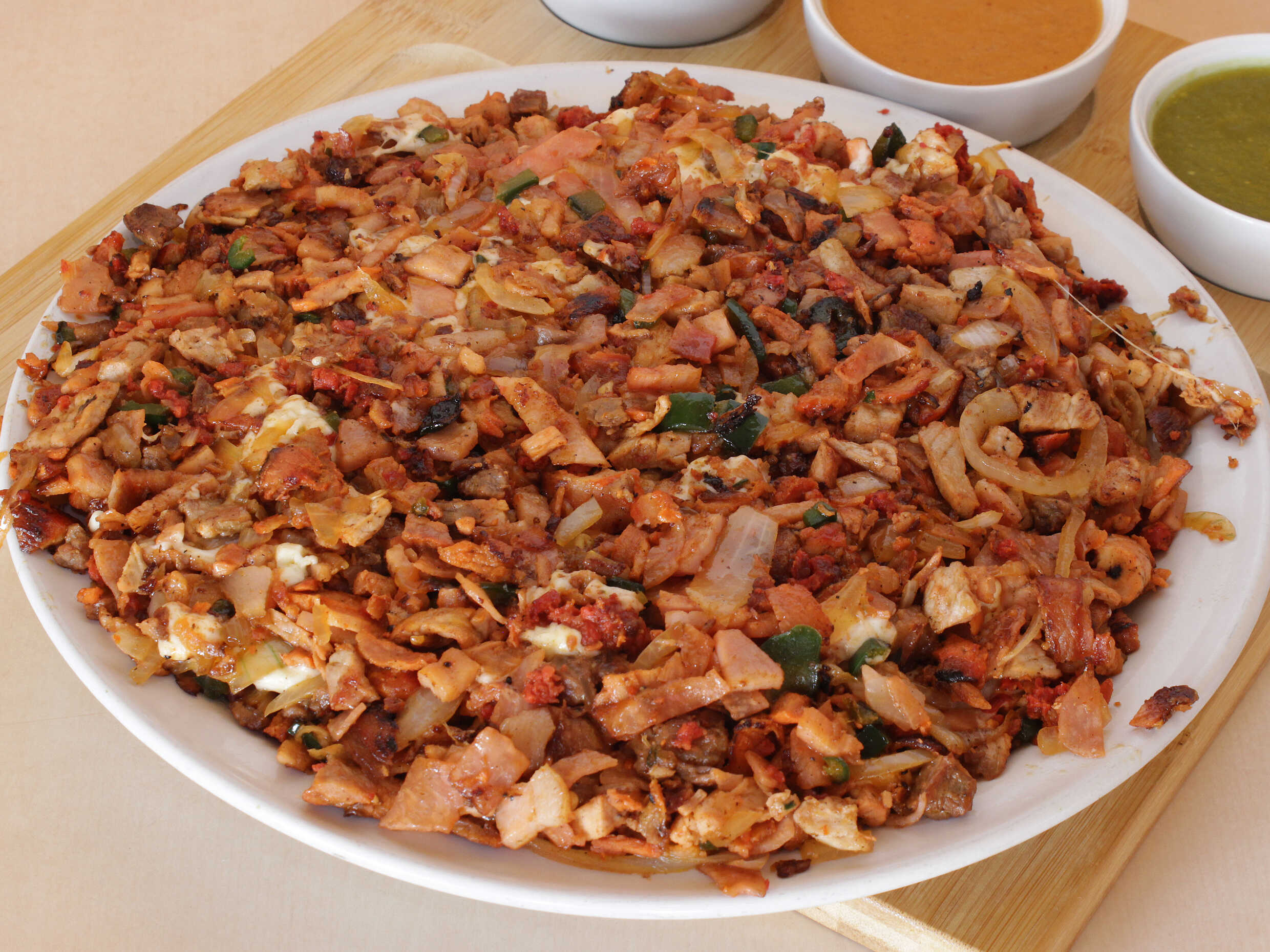 PIMIENTO, CEBOLLA, TOCINO, CHULETA, CHORIZO, PASTOR, QUESO Y JAMON.