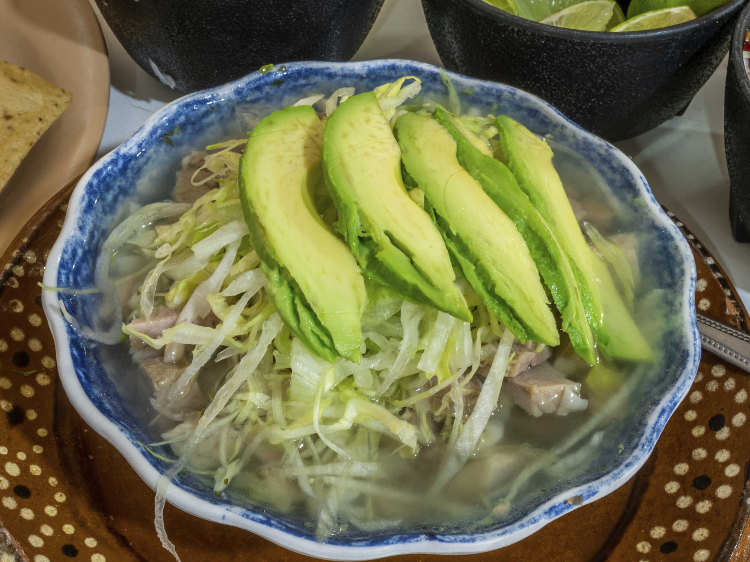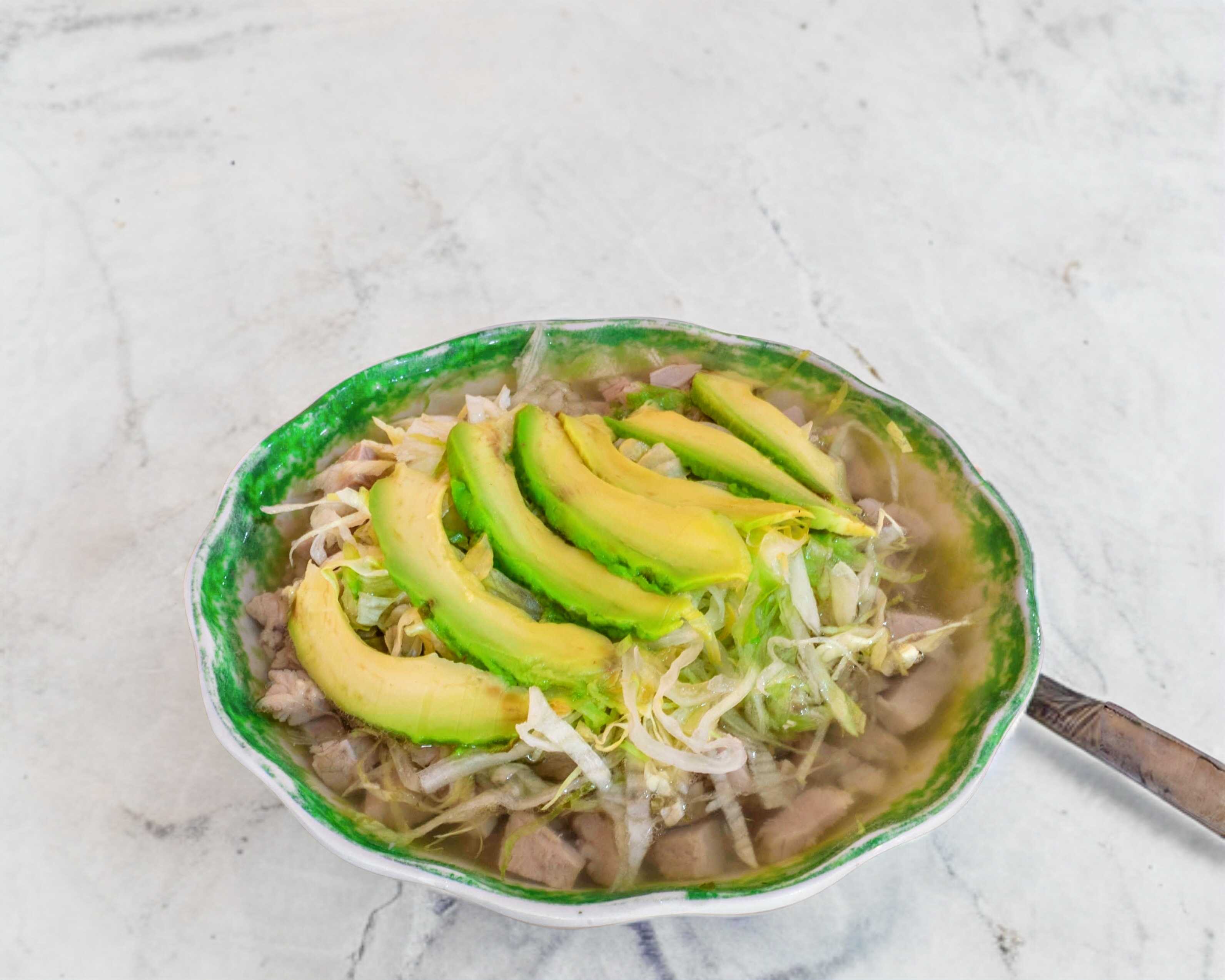 Maiz pozolero, maciza de cerdo, lechuga, aguacate y guarniciones