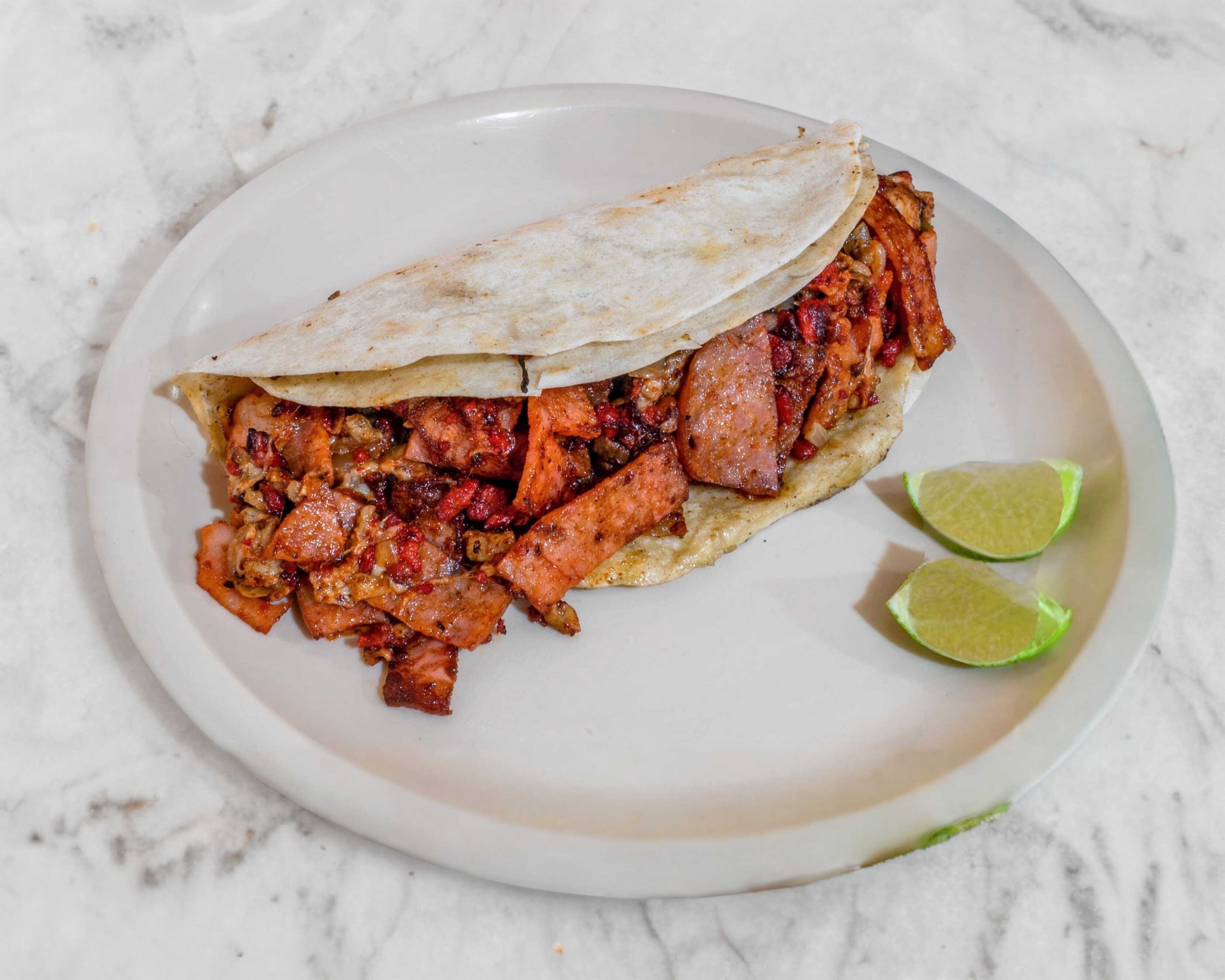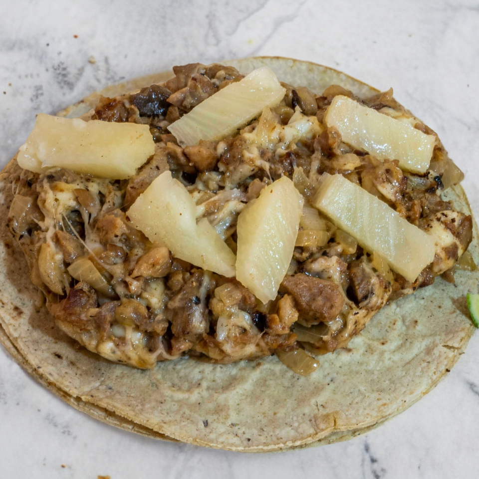 Carne arabe con queso y piña en tortilla de maiz