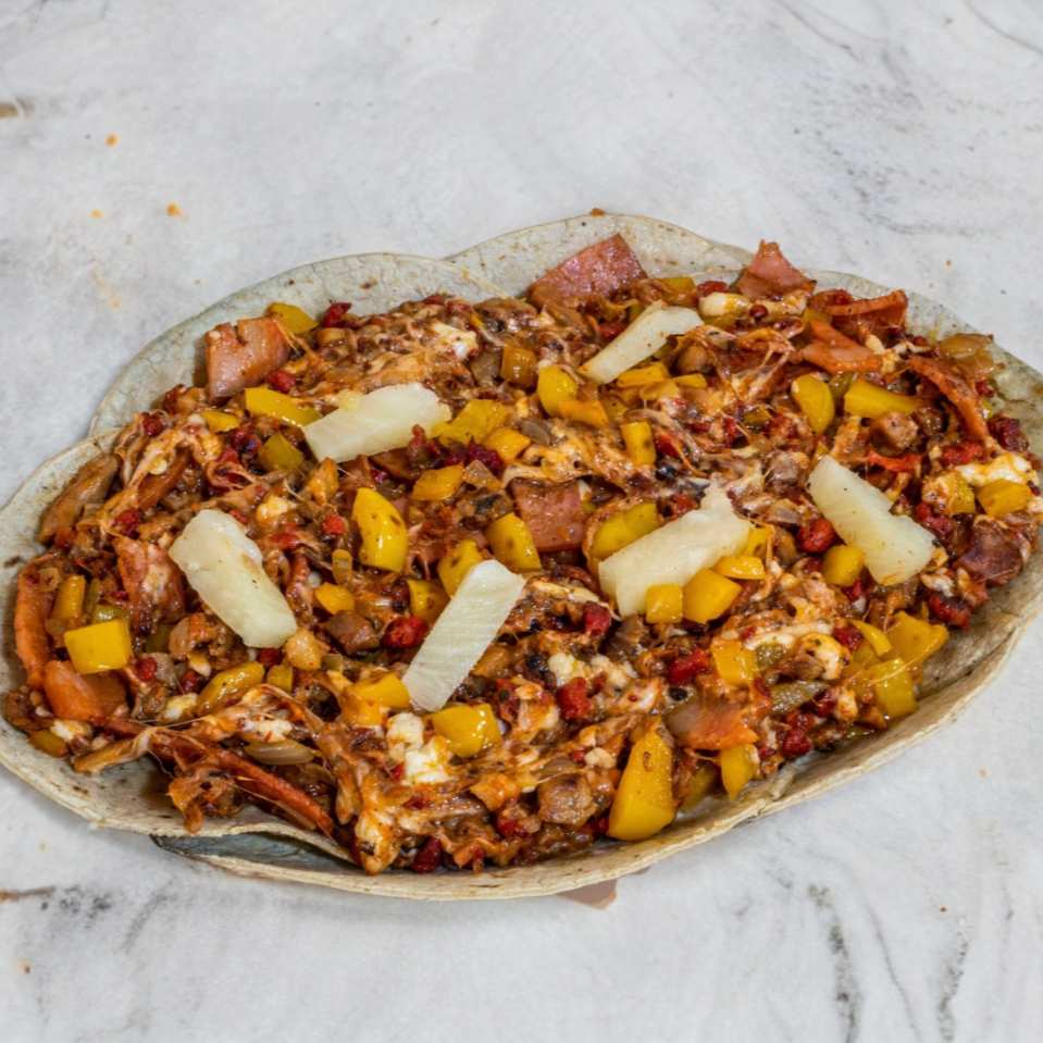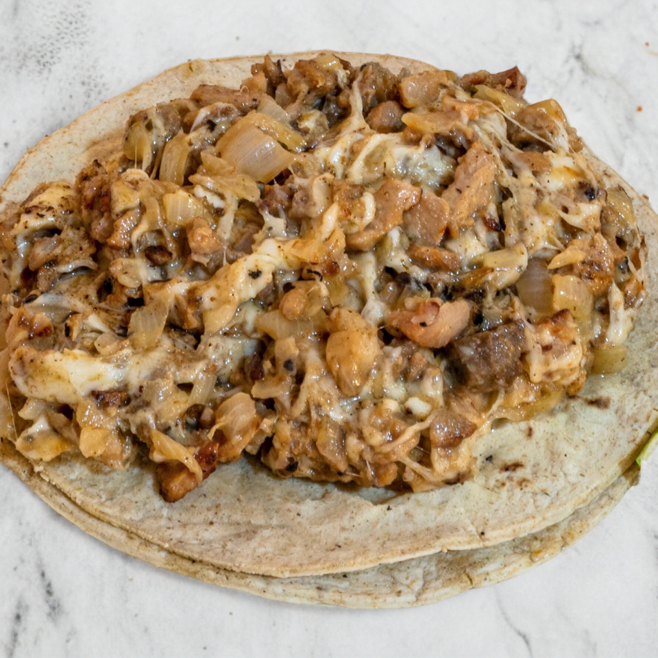 Carne arabe, quesillo, tocino, chorizo en 2 tortillas de harina