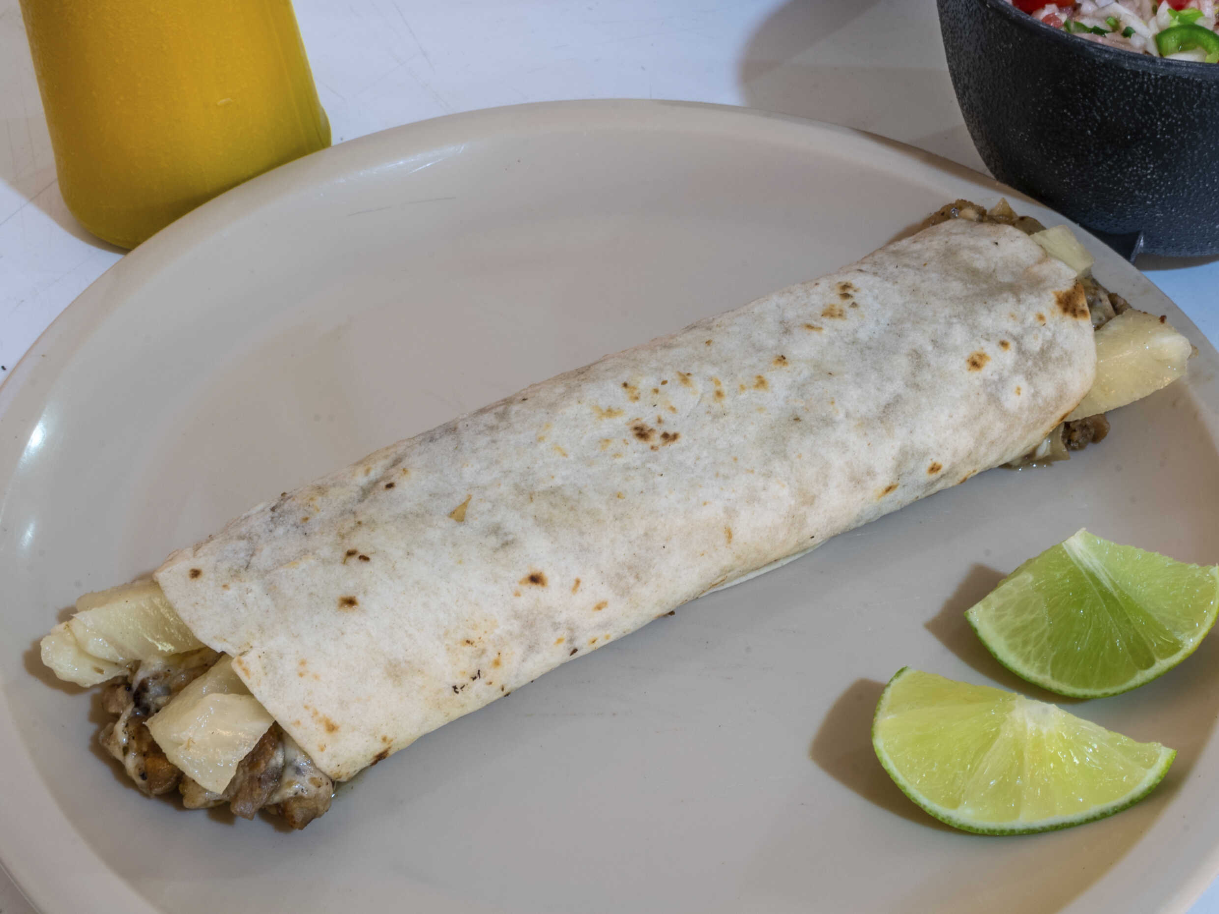 Carne arabe con queso y piña en tortilla de harina