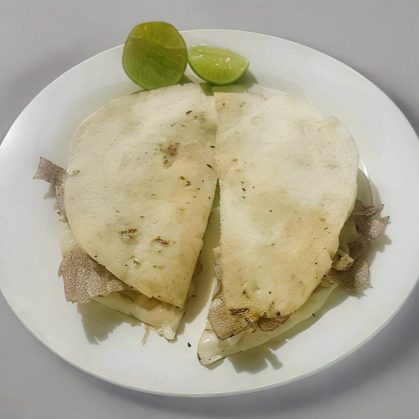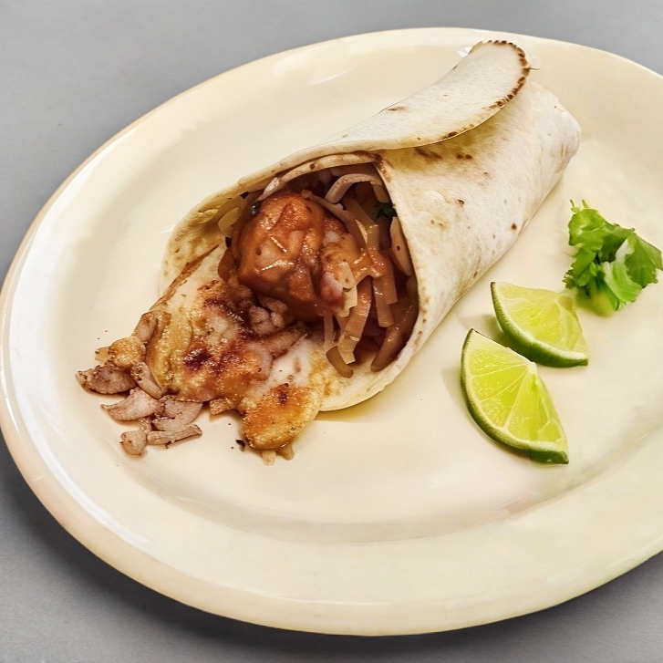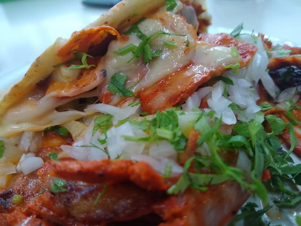 1 Pza Tortilla de harina con queso y carne al pastor, acompañada de cebolla, cilantro, piña y limón.