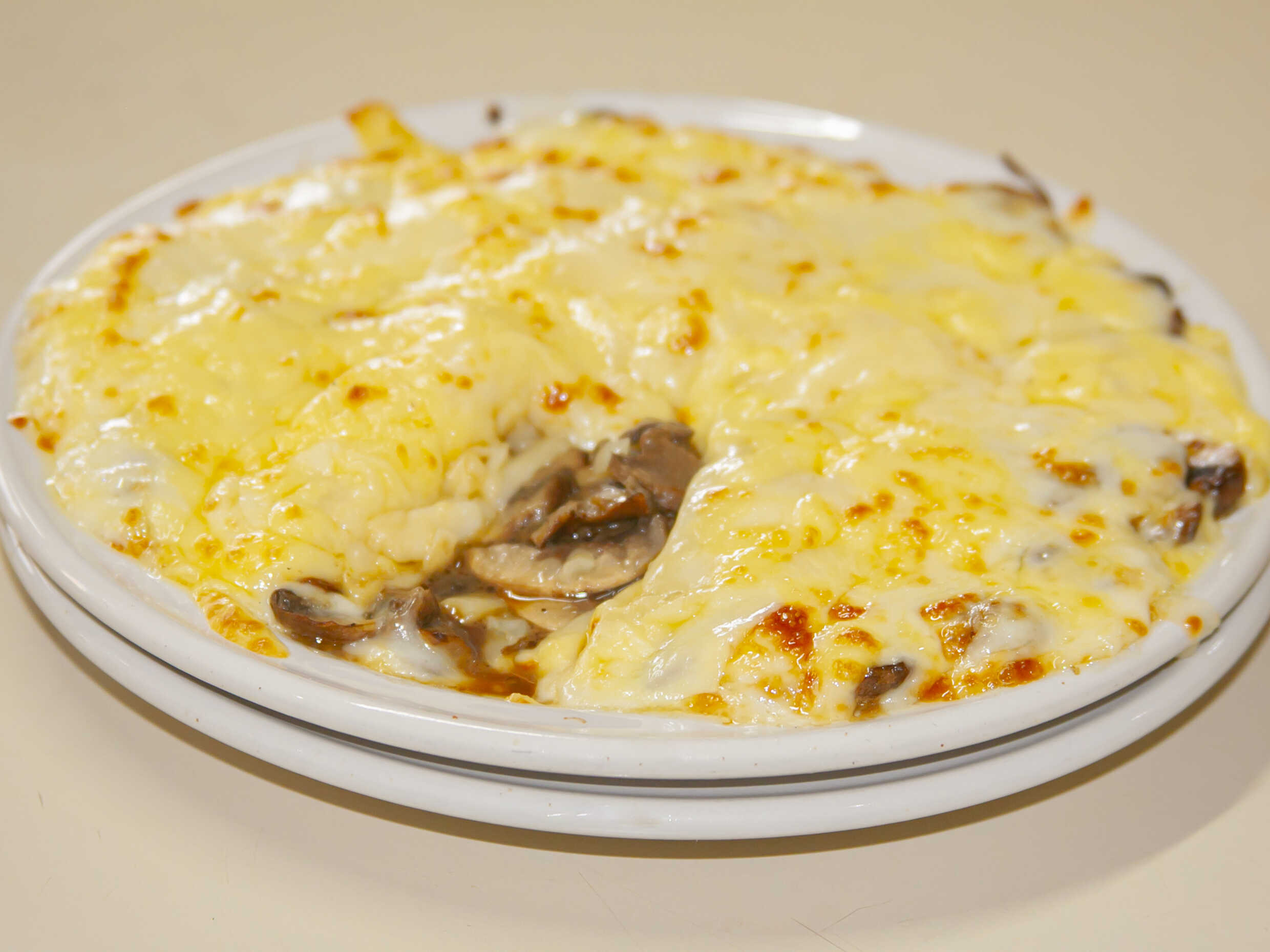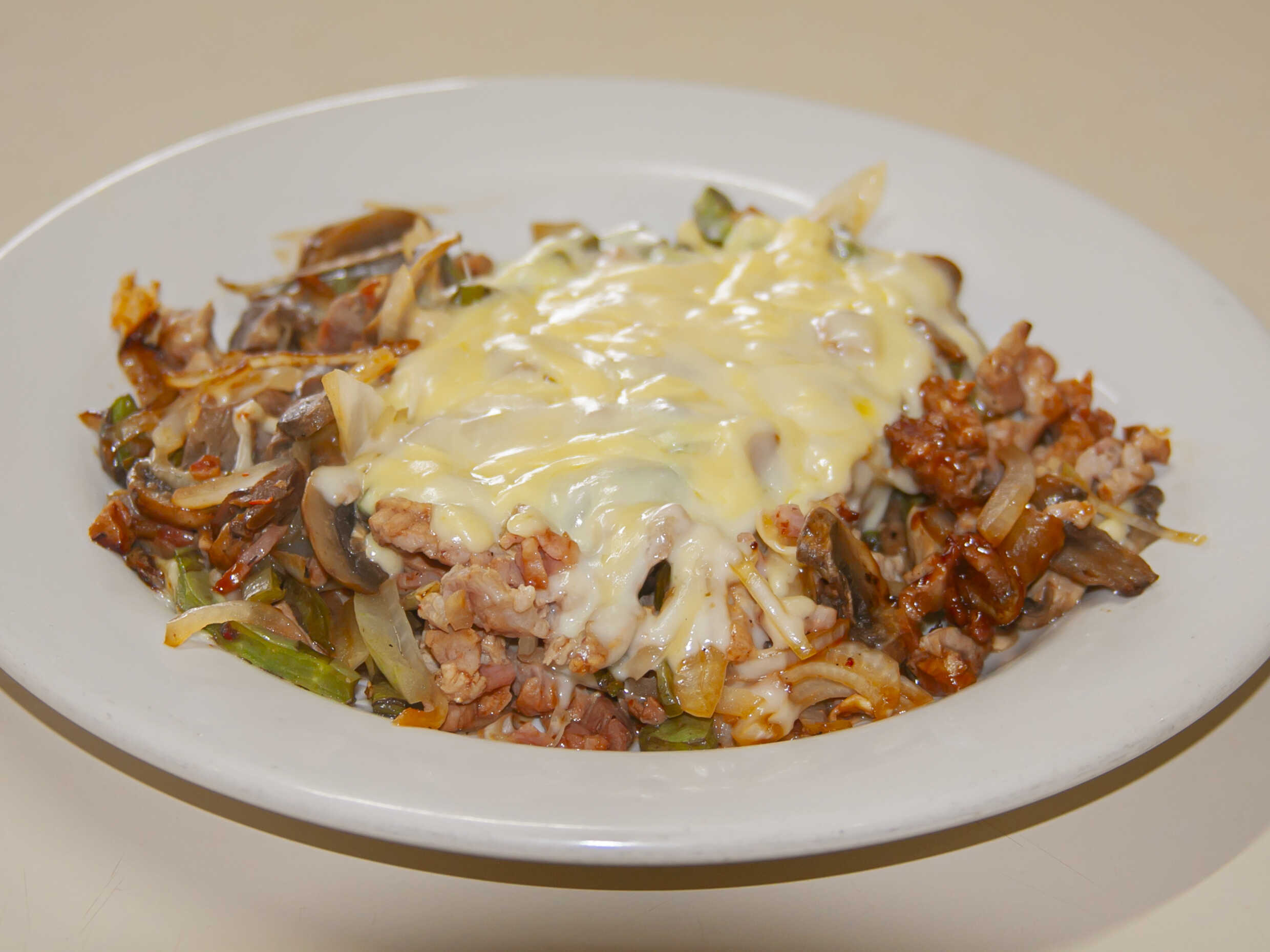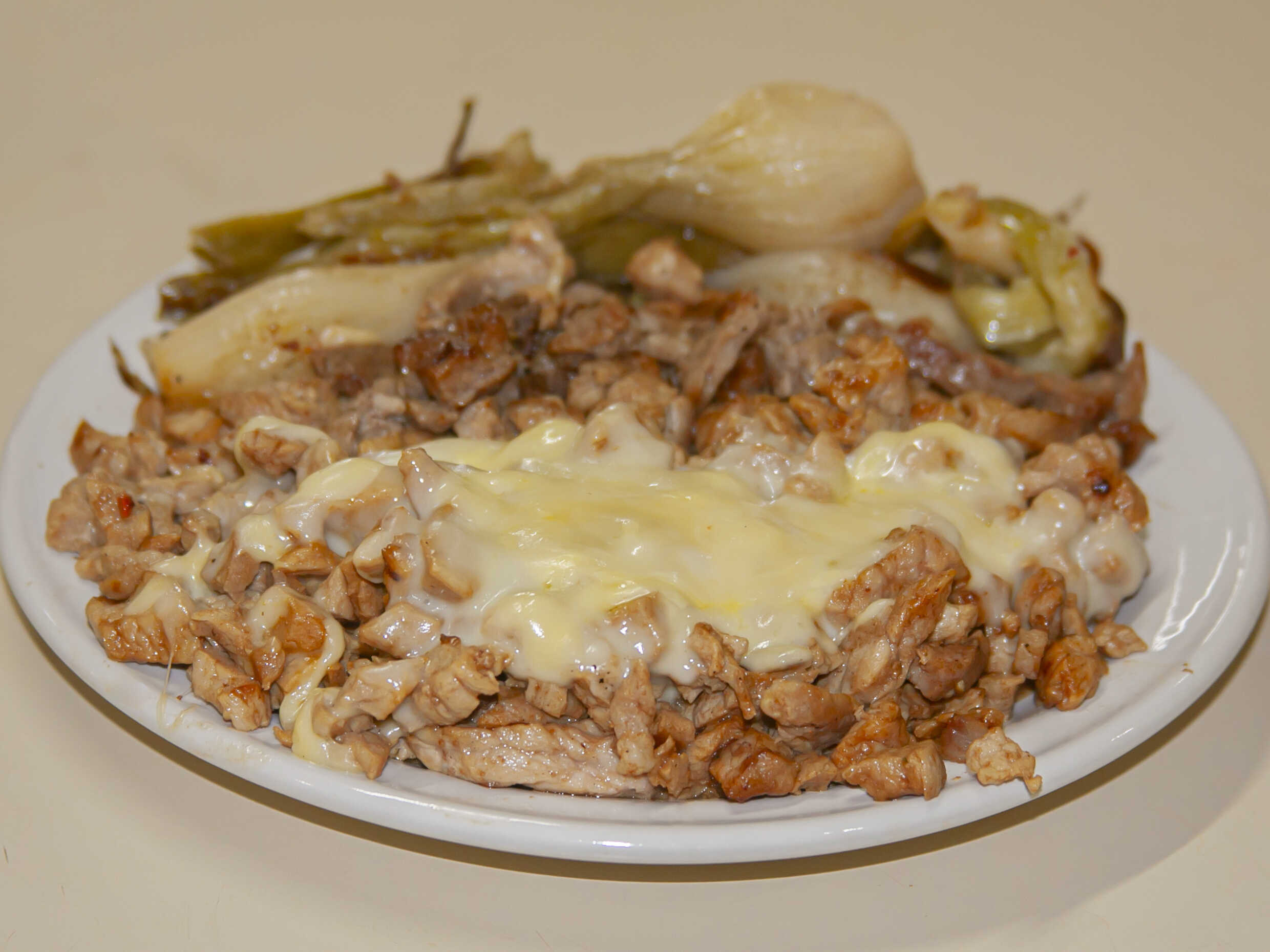 chuleta, tocino, champiñoñes, cebolla, nopales, queso