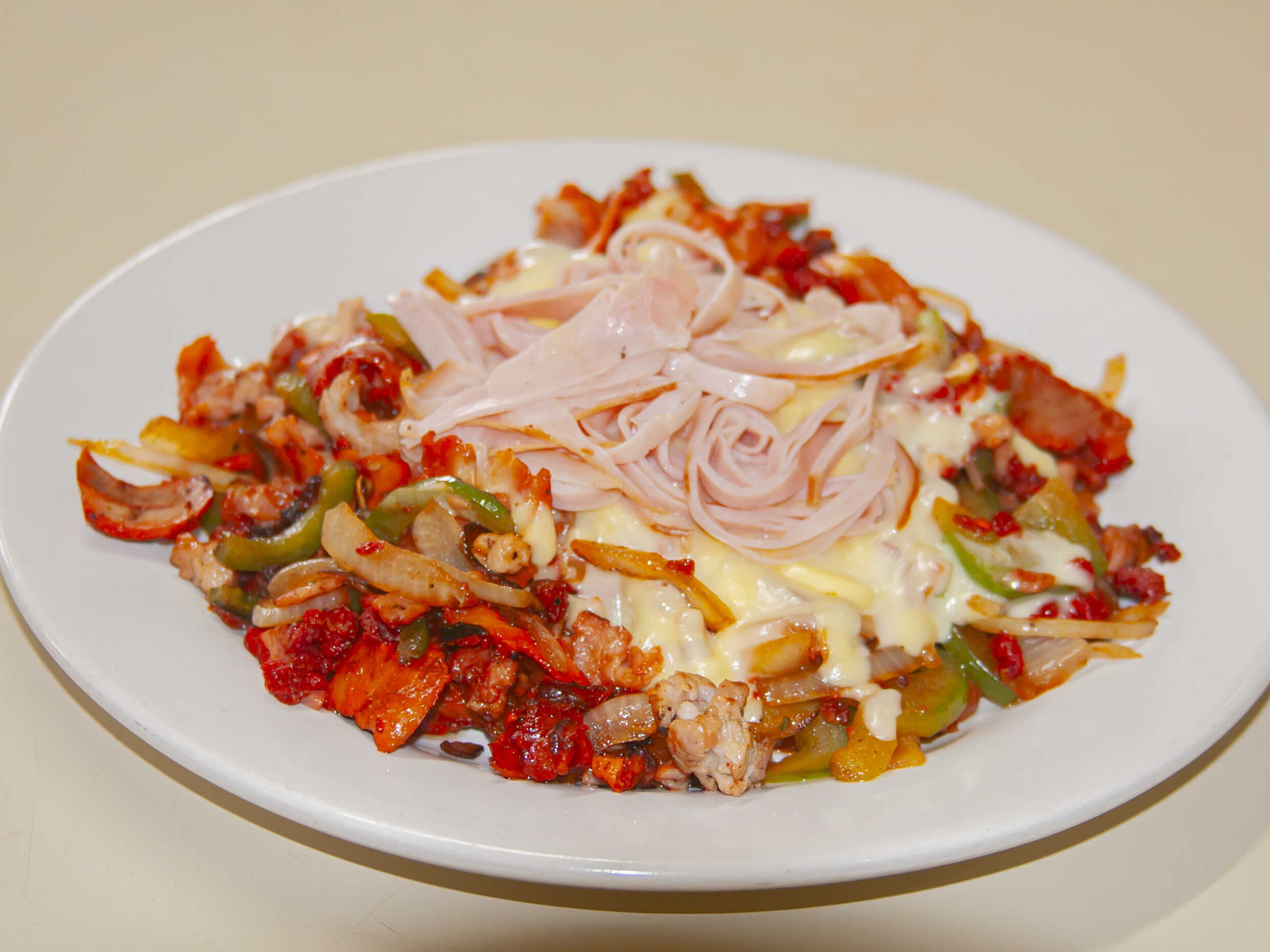 CARNE AL PASTOR, CHULETA, CHORIZO, PIMIENTO, CEBOLLA, QUESO, JAMON, TOCINO