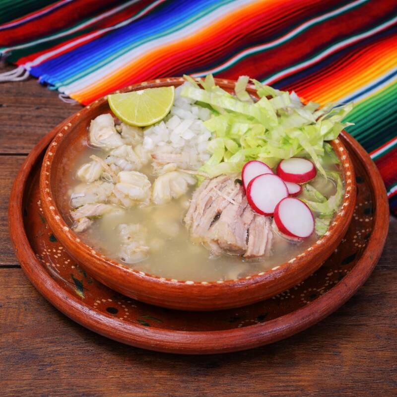 Pozole blanco de Carne de Cerdo (Incluye Maíz, Carne, Lechuga, Aguacate, Especias y Orden de Tostadas)