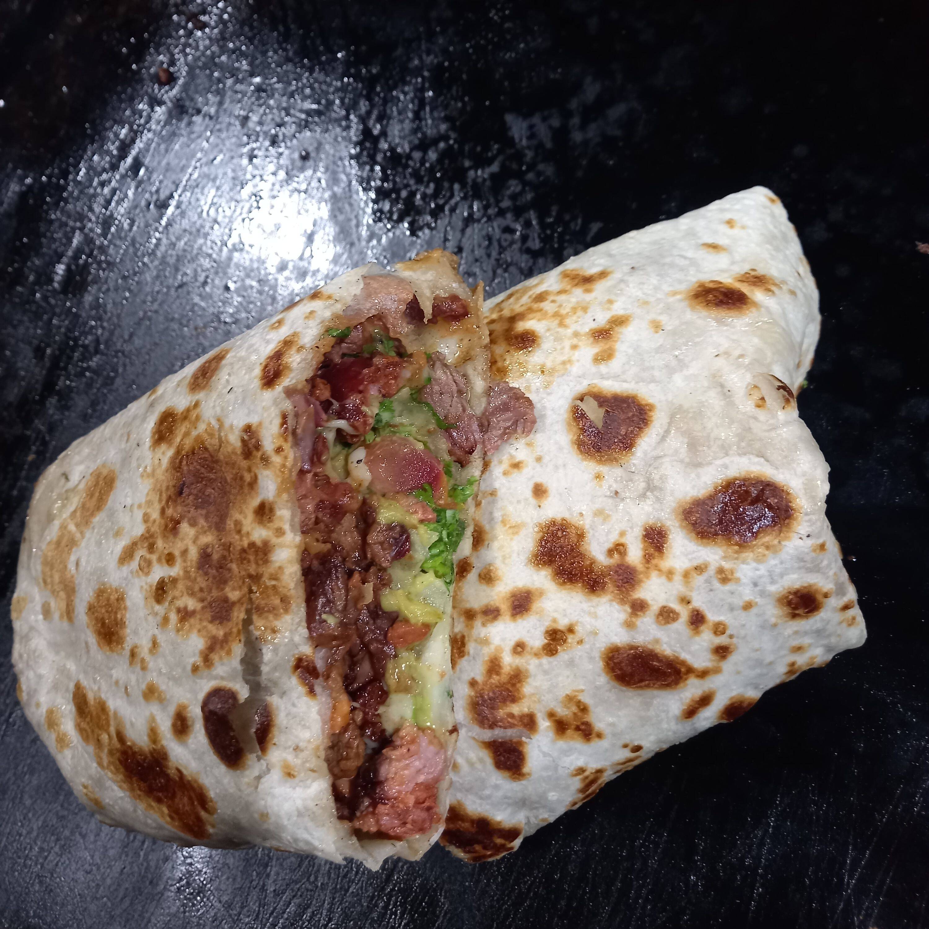 TORTILLA DE HARINA 28 CM CON CARNE ALAMBRE FRIJOLES QUESO FUNDIDO LECHUGA JITOMATE SILANTRO SALSAS LIMONES APARTE