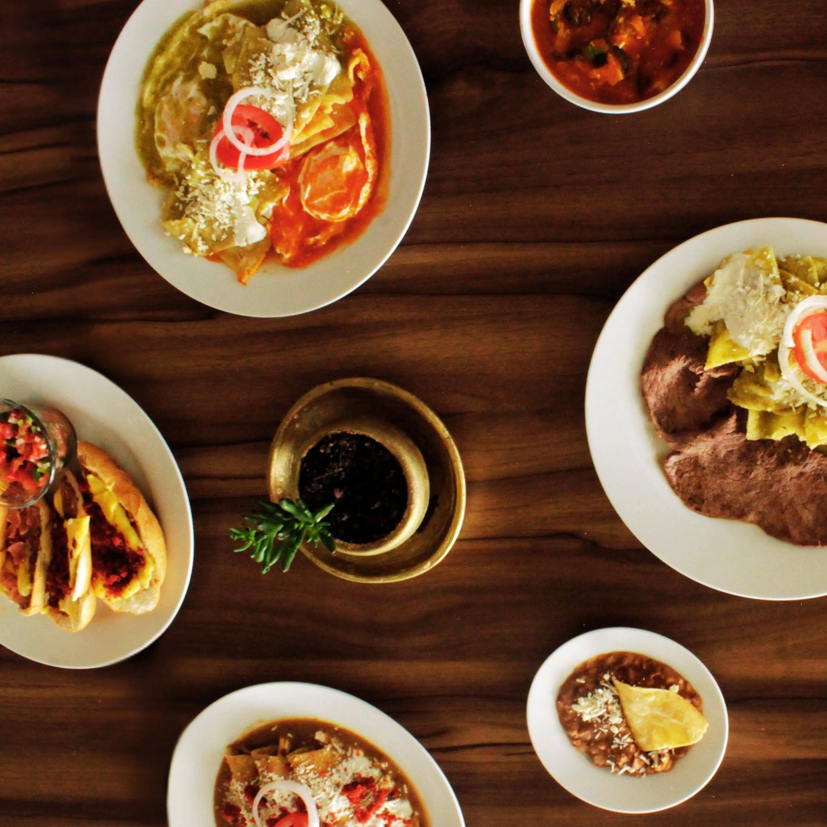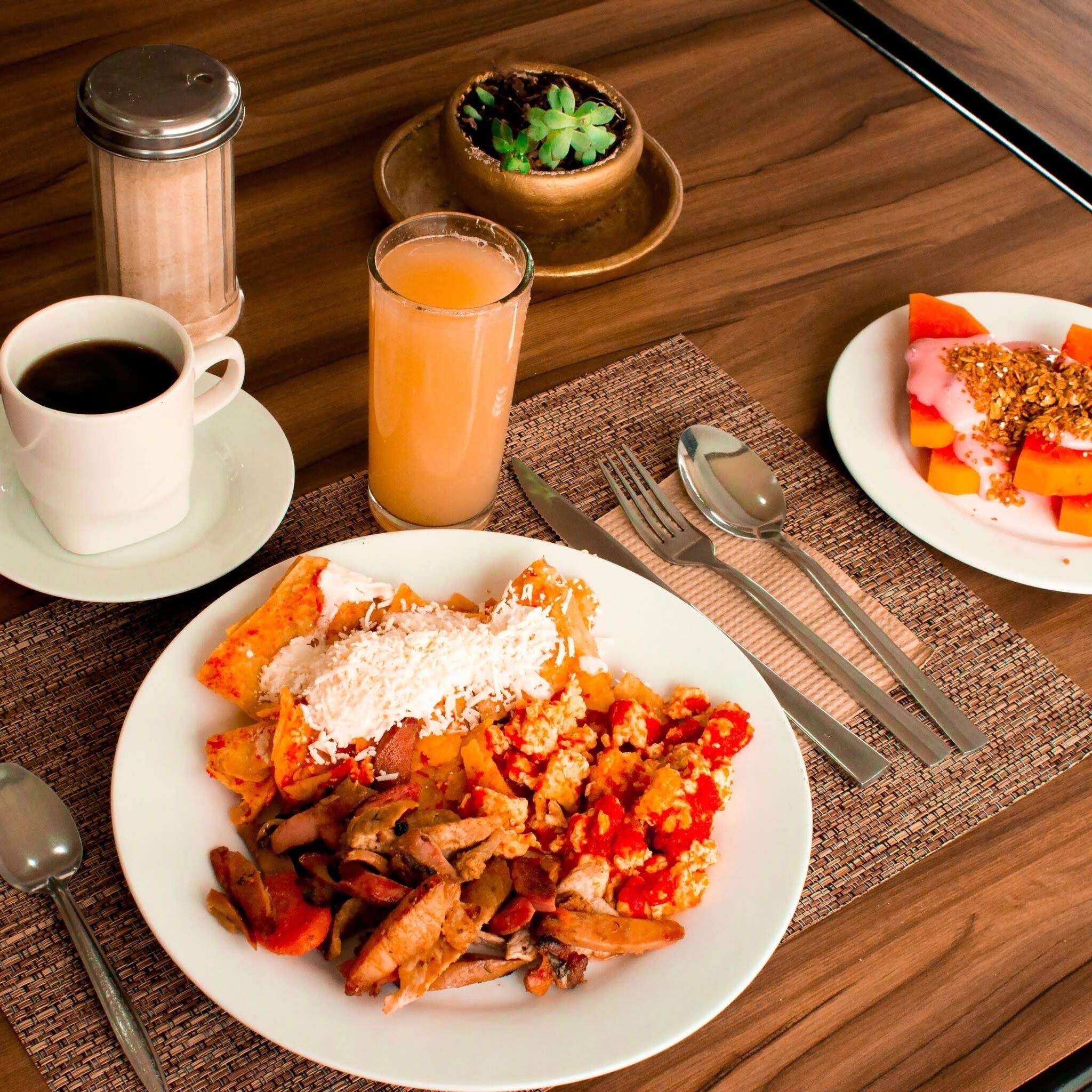 Trozos de tortilla fritos, bañados en salsa verde o roja. con crema, queso, cebolla y jitomate. Acompañados con huevo frito. Incluyen café o té, jugo o fruta y pan.
