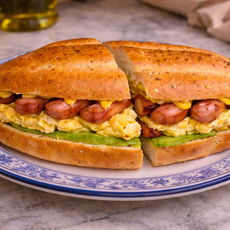 Exquisita torta a la plancha de huevo con salchicha, con una cama de frijoles, acompañada de aguacate, rajas o chipotle, mayonesa, jitomate