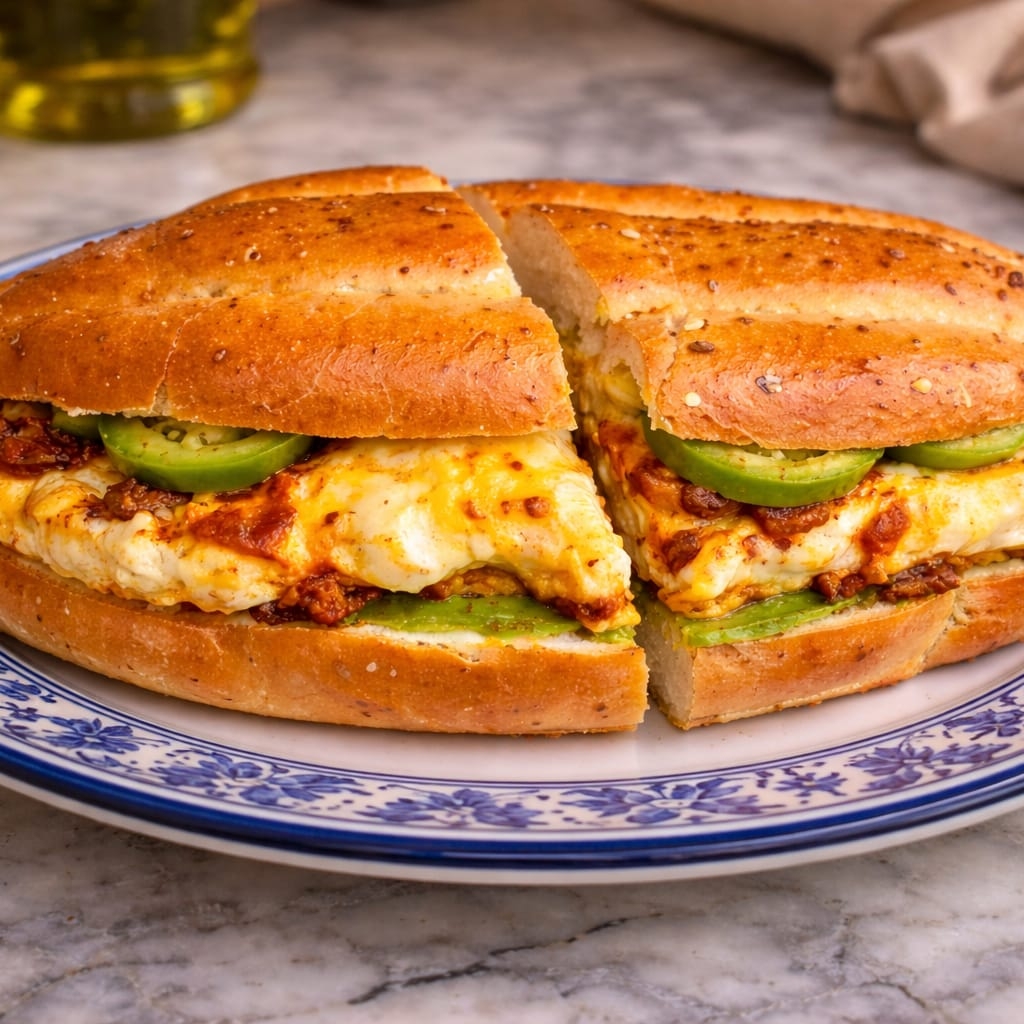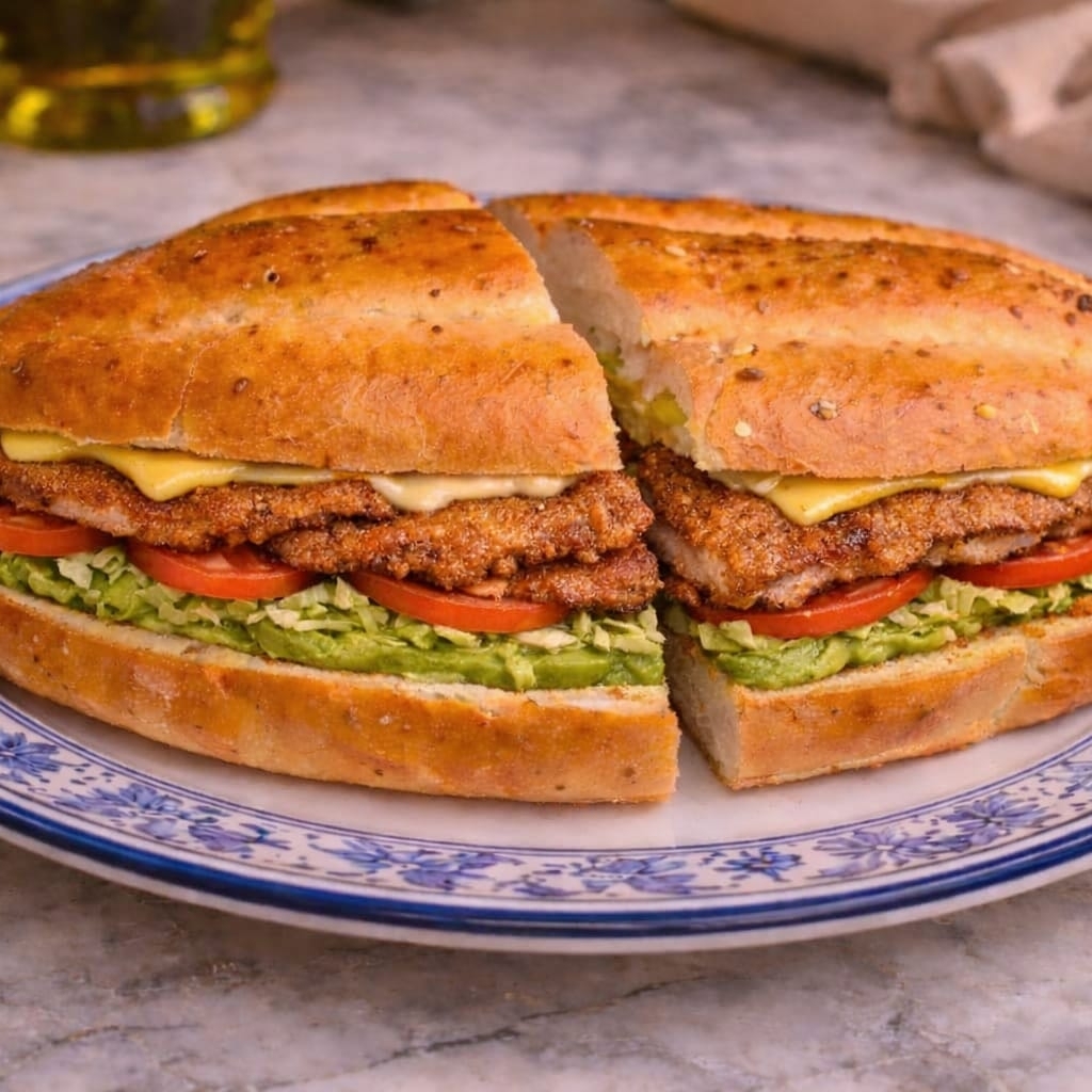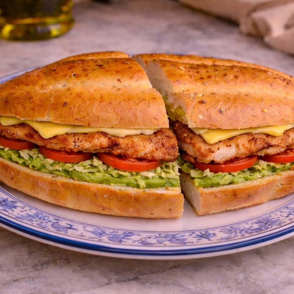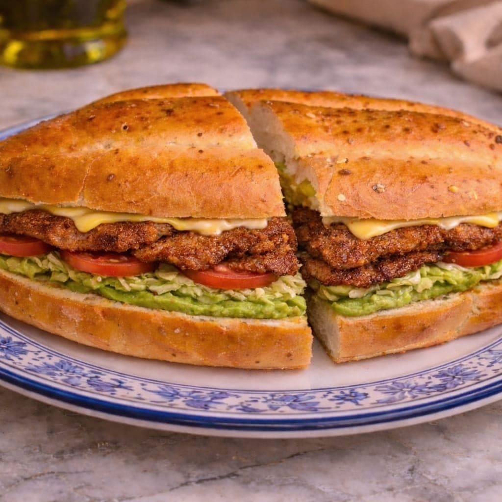 Exquisita torta a la plancha de milanesa de pollo, con una cama de frijoles, acompañada de aguacate, rajas o chipotle, mayonesa, jitomate y queso