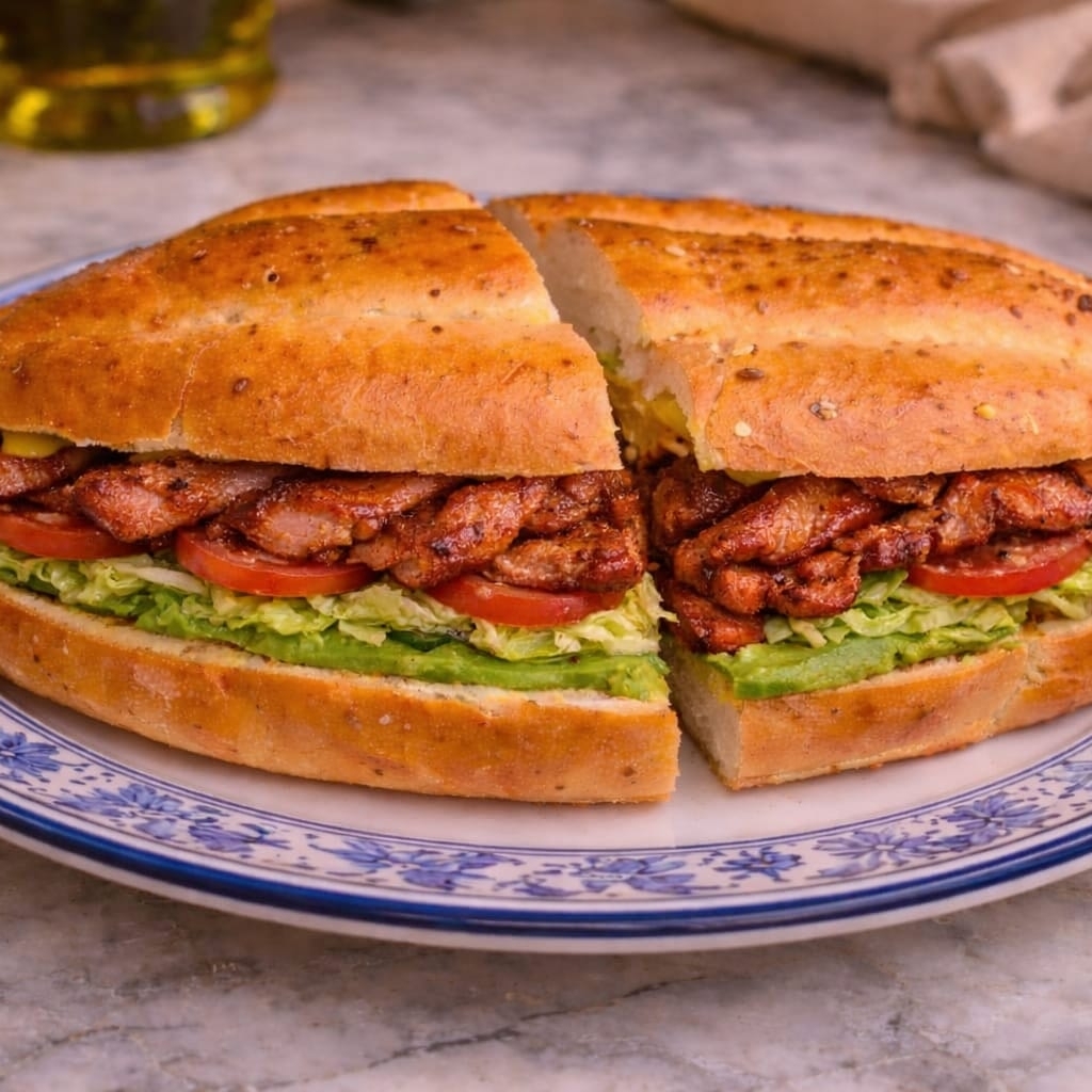 Exquisita torta a la plancha de milanesa de cerdo, con una cama de frijoles, acompañada de aguacate, rajas o chipotle, mayonesa, jitomate y queso