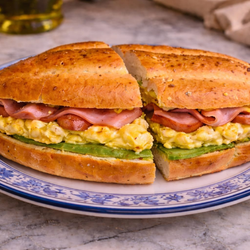 Exquisita torta a la plancha de huevo con jamon, con una cama de frijoles, acompañada de aguacate, rajas o chipotle, mayonesa, jitomate