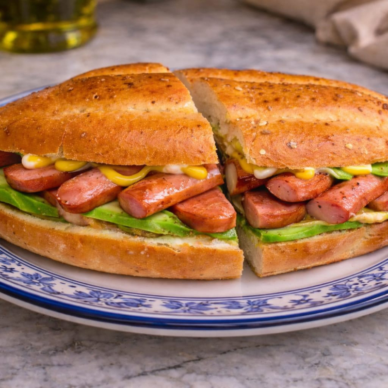 Exquisita torta a la plancha de salchicha, con una cama de frijoles, acompañada de aguacate, rajas o chipotle, mayonesa, jitomate