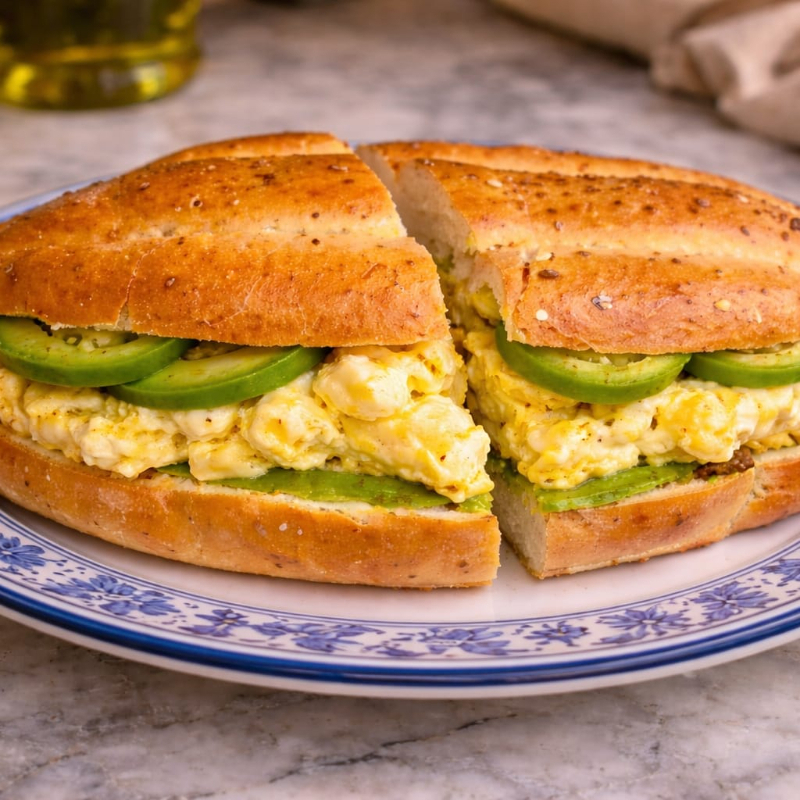 Exquisita torta a la plancha de huevo, con una cama de frijoles, acompañada de aguacate, rajas o chipotle, mayonesa, jitomate