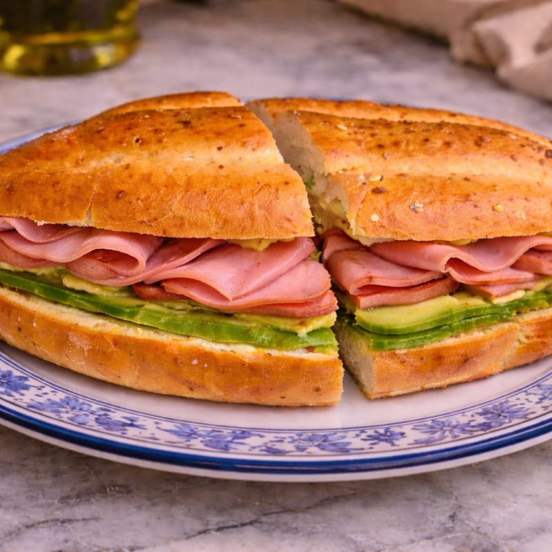 Exquisita torta a la plancha de Jamon, con una cama de frijoles, acompañada de aguacate, rajas o chipotle, mayonesa, jitomate