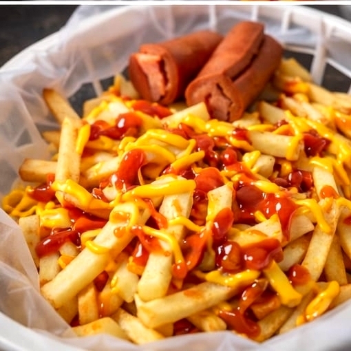 papa corte delgado, fritas, salchicha con cortes simulando un pulpo y sazonadas. acompañada del toping de tu preferencia
