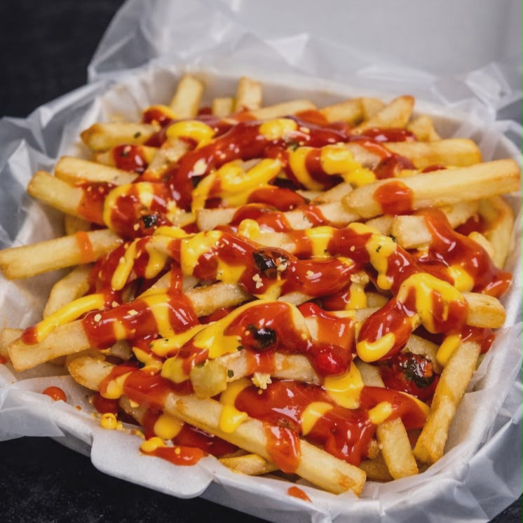 papa corte delgado, fritas y sazonadas. acompañada del toping de tu preferencia